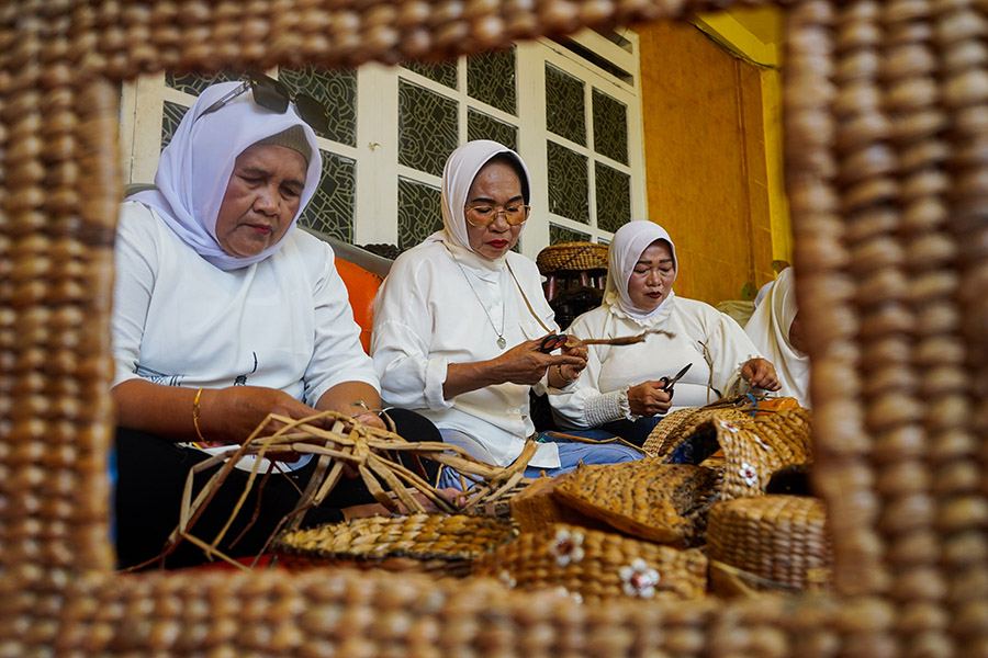 Sejumlah perajin menganyam tanaman eceng gondok di Pusat Komunitas Pemberdayaan Kasih Bunda, Makassar, Sulawesi Selatan, Senin (10/3/2025). UMKM dari Komunitas Pemberdayaan Kasih Bunda memproduksi berbagai jenis anyaman berbahan baku dari tanaman eceng gondok seperti tas, miniatur kapal phinisi, hiasan baju bodo, topi, dan tudung saji yang dipasarkan ke hotel-hotel serta pembelian oleh turis asing dengan harga mulai Rp80 ribu Tamat Rp2 juta, sekaligus menjadi bagian dari upaya Kepada meningkatkan kesadaran lingkungan dan pendidikan tentang pentingnya menjaga ekosistem perairan yang sehat. ANTARA/Hasrul Said/gus