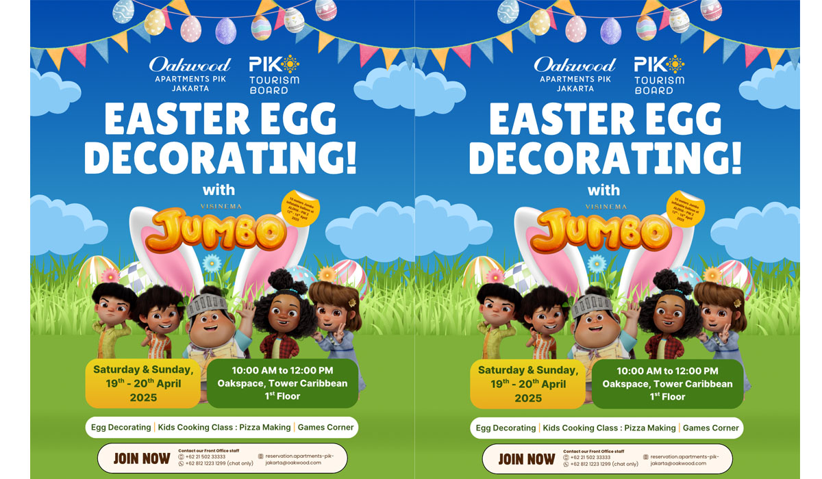 DALAM rangka merayakan akhir pekan Paskah, Oakwood Apartments PIK Jakarta bekerja sama dengan PIK Tourism Board dan Kepribadian Jumbo dari Visinema, menyelenggarakan acara Easter Egg Decorating selama dua hari yang dirancang Kepada mengajak keluarga berkreasi melalui kegiatan yang edukatif dan menyenangkan. Acara ini akan berlangsung pada Copot 19 dan 20 April 2025, pukul 10.00 hingga 12.00 WIB di Oakspace Function Room yang terletak di Dasar satu Oakwood Apartments PIK Jakarta – Tower Caribbean.