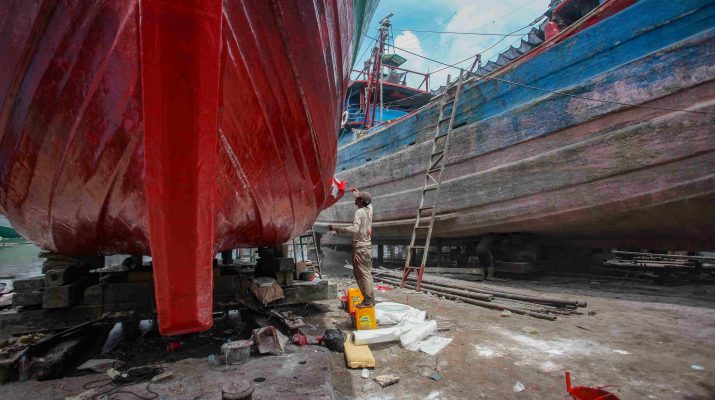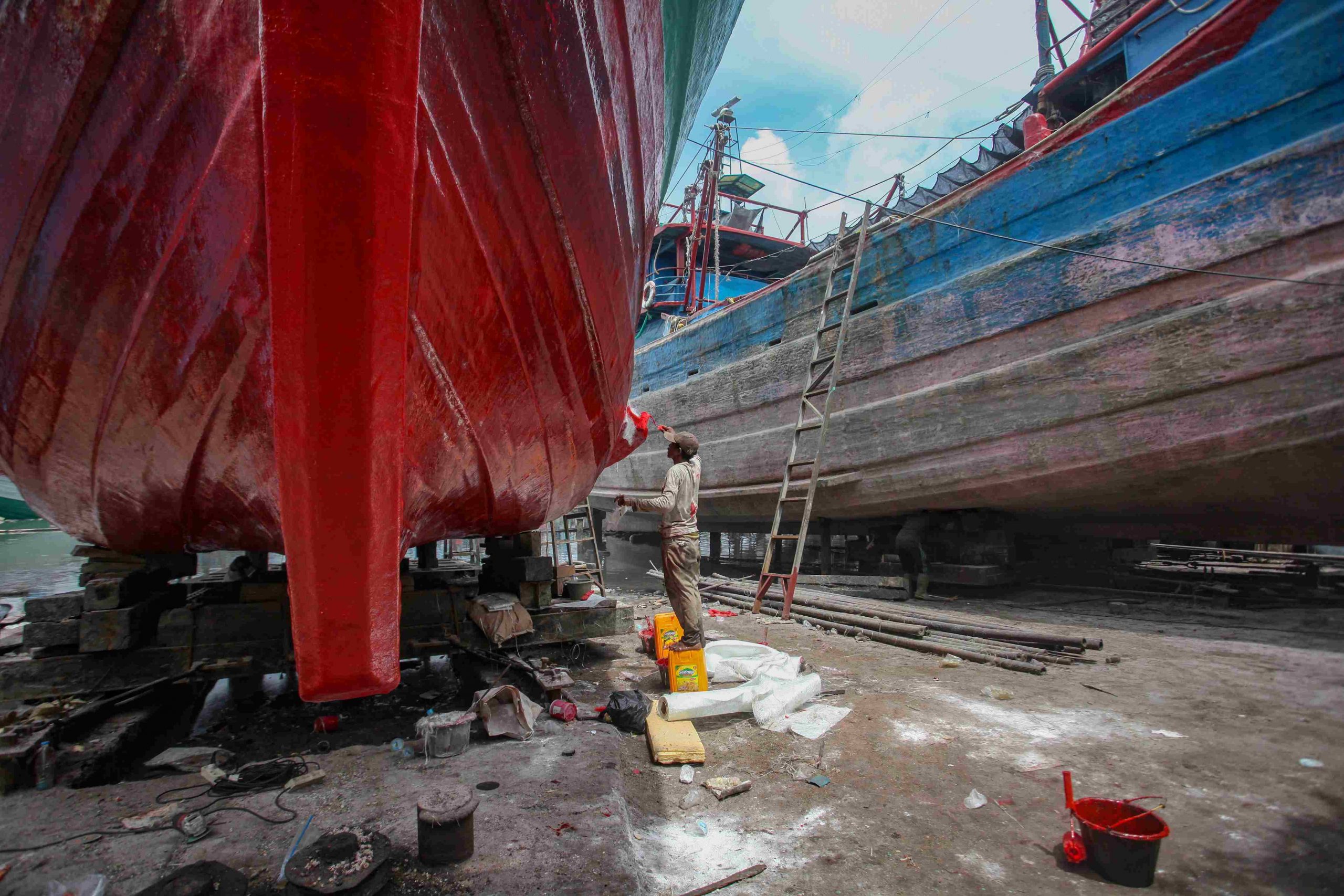 Aktivitas pekerja memperbaiki kapal nelayan di Unit Docking Kapal Perikanan Muara Angke, Penjaringan, Jakarta Utara, Minggu (16/2/2024). Menurut pekerja, proses perbaikan kapal skala ringan berupa mengamplas cat lelet hingga melapisi membran serat fiber dari haluan hingga buritan memerlukan waktu satu minggu. Sedangkan perbaikan skala besar berupa pergantian mesin dan pelapisan Bisa memakan waktu hingga satu bulan. MI/Usman Iskandar/Per