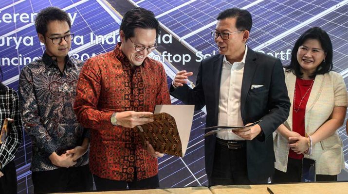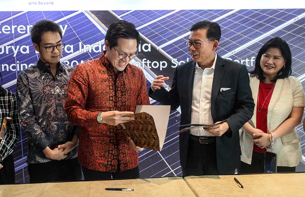 Wholesale Banking Director, UOB Indonesia Harapman Kasan (kedua kanan) dan Vice President of Commercial Xurya Daya Indonesia Adhi Laksamanaputra Soeyana (kedua kiri) didampingi Head of Commercial Banking UOB Indonesia Fenny Wiratama (kanan), dan Managing Director Xurya Daya Indonesia (XDI) Eka Himawan berbincang usai melakukan penandatanganan perjanjian kerja sama fasilitas green term loan senilai Rp350 miliar di Jakarta, Senin (16/6/2025). Pembiayaan UOB melalui program U-Solar tersebut mendukung lebih dari 50 perusahaan komersial dan industri dari berbagai sektor, Bagus lokal maupun multinasional, dalam adopsi Daya surya dengan kapasitas Tamat dengan 130MWp. MI/Usman Iskandar