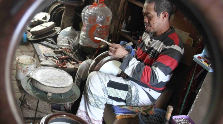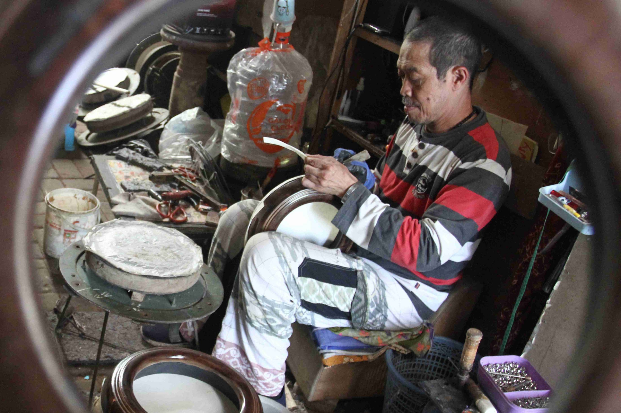 Perajin Membikin alat musik rebana di Tunggulwulung, Malang, Jawa Timur, Rabu (12/3/2025). Menurut perajin permintaan perbaikan dan pembuatan alat musik rebana sejak awal bulan Ramadan meningkat dari kisaran 45 buah menjadi 60 buah per bulan yang dijual dengan harga Rp75 ribu hingga Rp1,5 juta ke berbagai daerah. ANTARA FOTO/Ari Bowo Sucipto/Ppj
