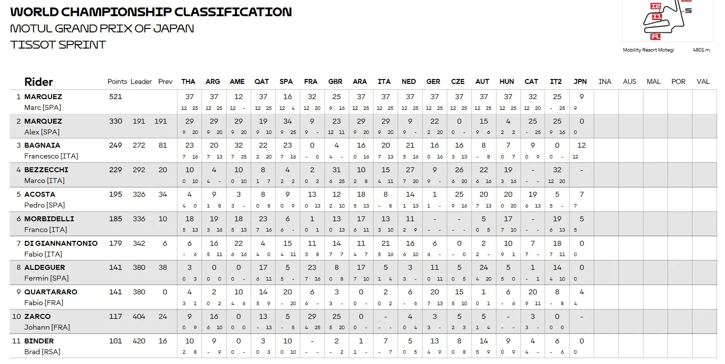 liputanindo.com – Seperti Kita ketahui Serempak akhirnya Marc Marquez berhasil finish Podium 2 di balapan Sprint MotoGP Motegi 2025 dan meraih 9 point Kepada ditambahkan ke Klasemen. Dengan Alex Marquez yang finish di P10 ( Tak dapat poin), Maka jelang Balapan Istimewa esok ahad, Marc Marquez memimpin klasemen pebalap dengan 521 poin dan berjarak 191 poin dari Alex Marquez.