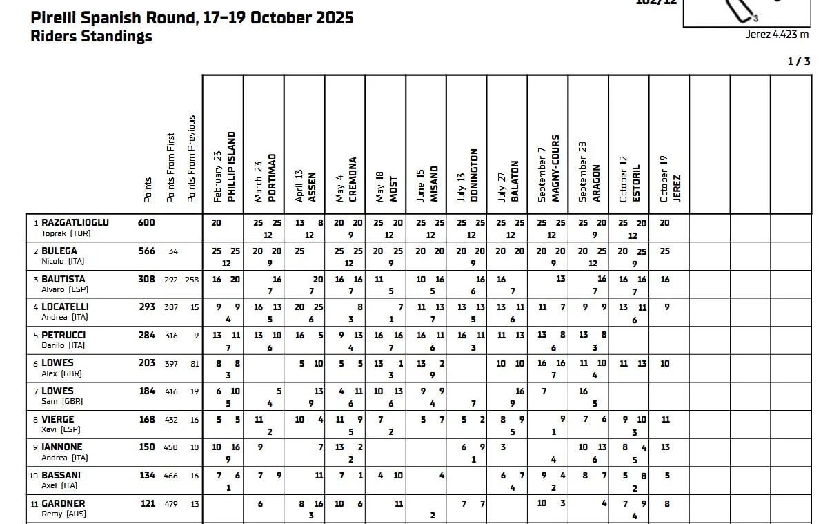 liputanindo.com – Seperti Kita ketahui Pasca Race 1 di WSBK Finale Jerez 2025 yang diMenangkan Oleh Bulega, Toprak Razgatlioglu (ROKiT BMW Motorrad WorldSBK Team) berpotensi mengunci gelar Pemenang WorldSBK ketiganya pasca Balapan Superpole Seri Finale Jerez akhir pekan ini. Dengan Keistimewaan 34 poin atas Bulega, Toprak berpeluang Kepada menyegel gelar Pemenang dengan beberapa catatan sebagai Berikut ini