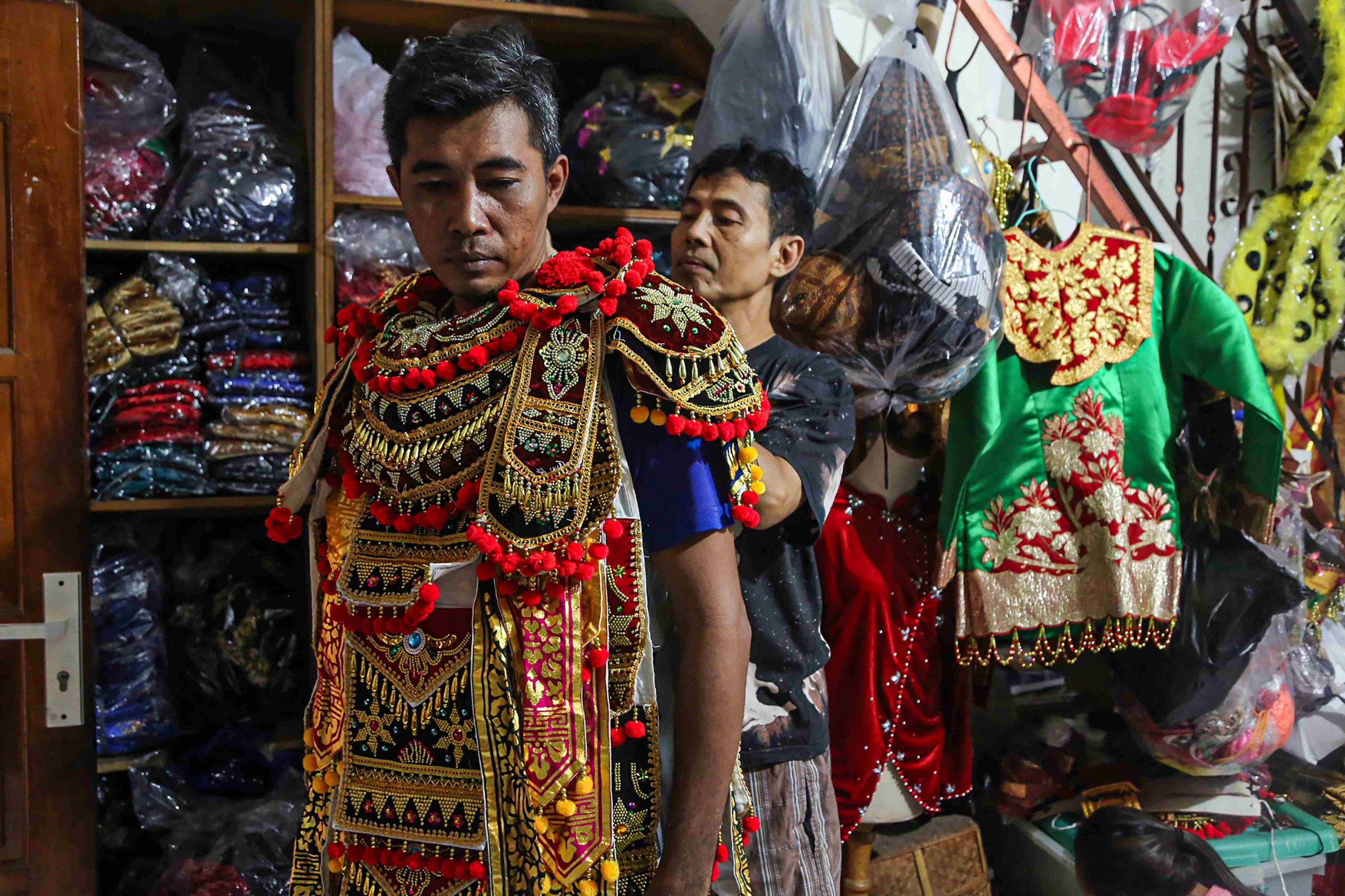 Pemilik bisnis melayani calon konsumen mencoba busana adat Bali sebelum disewa di Saraswati Collection, Semarang, Jawa Tengah, Sabtu (16/8/2025). Menurut pemilik usaha, permintaan penyewaan berbagai Macam-macam busana dan aksesoris adat tradisional Buat keperluan perayaan HUT ke-80 Republik Indonesia meningkat dari 20 set baju menjadi 500 set baju dengan harga Rp150 ribu hingga Rp1 juta per set tergantung ukuran dan jenis baju adatnya. ANTARA FOTO/Maksud Zaezar/Ppj
