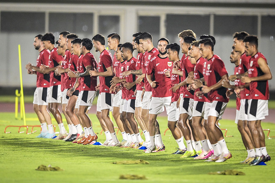 Sejumlah pesepak bola Timnas Indonesia melakukan pemanasan Ketika sesi latihan jelang melawan Timnas China di Stadion Madya, Komplek GBK, Senayan, Jakarta, Senin (2/6/2025). Latihan tersebut sebagai persiapan jelang melawan Timnas Tingkok dalam laga kualifikasi Piala Dunia FIFA 2026 Area Asia Grup C di Stadion Istimewa Gelora Bung Karno, Jakarta pada Kamis (5/6). ANTARA/Bayu Pratama S/gusĀ