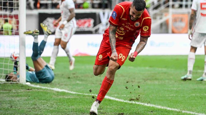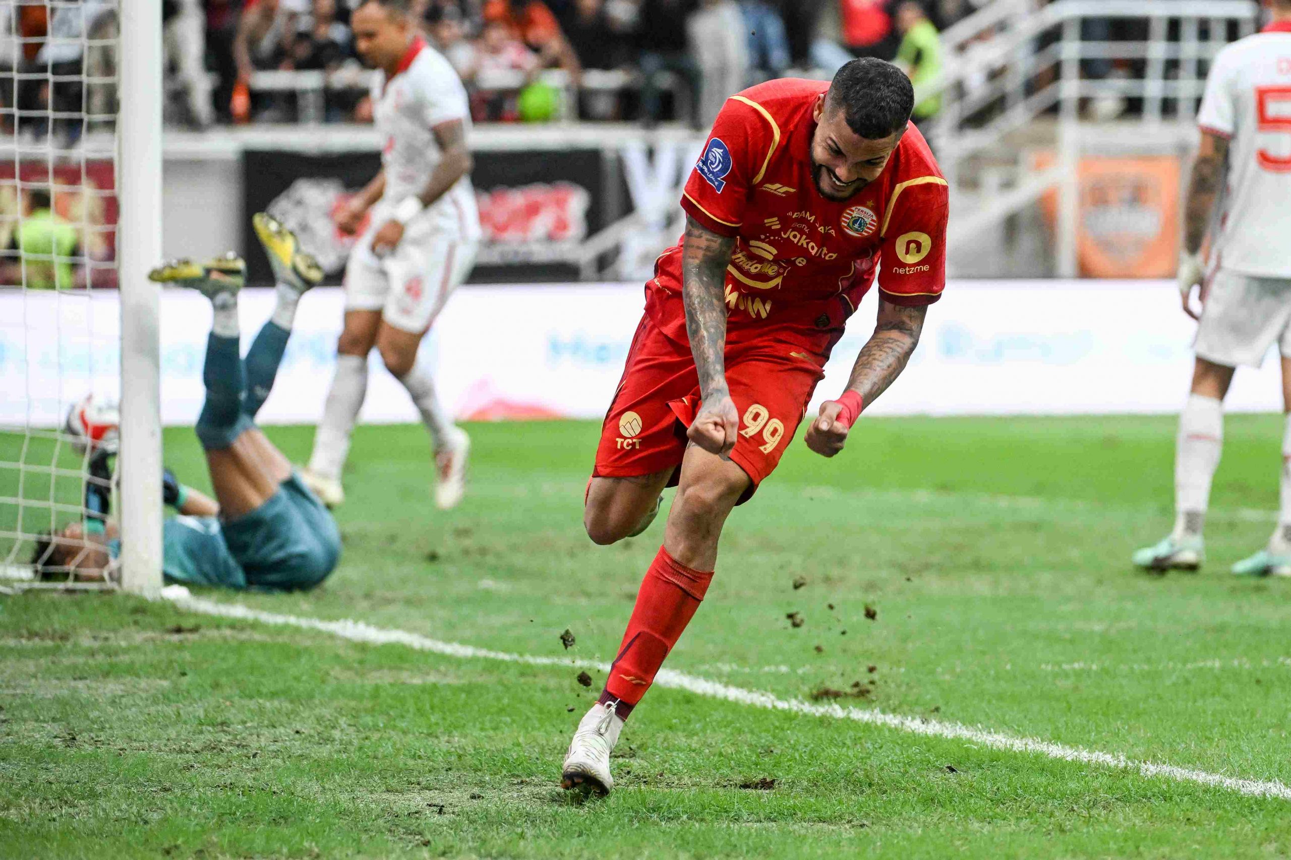 Pesepak bola Persija Jakarta Emaxwell Souza de Lima melakukan selebrasi usai mencetak gol ke gawang Malut United Begitu BRI Super League di Jakarta International Stadium (JIS), Jakarta, Sabtu (23/8/2025). Persija Jakarta bermain imbang Rival Malut United dengan skor 1-1. ANTARA FOTO/Hafidz Mubarak A/Ppj