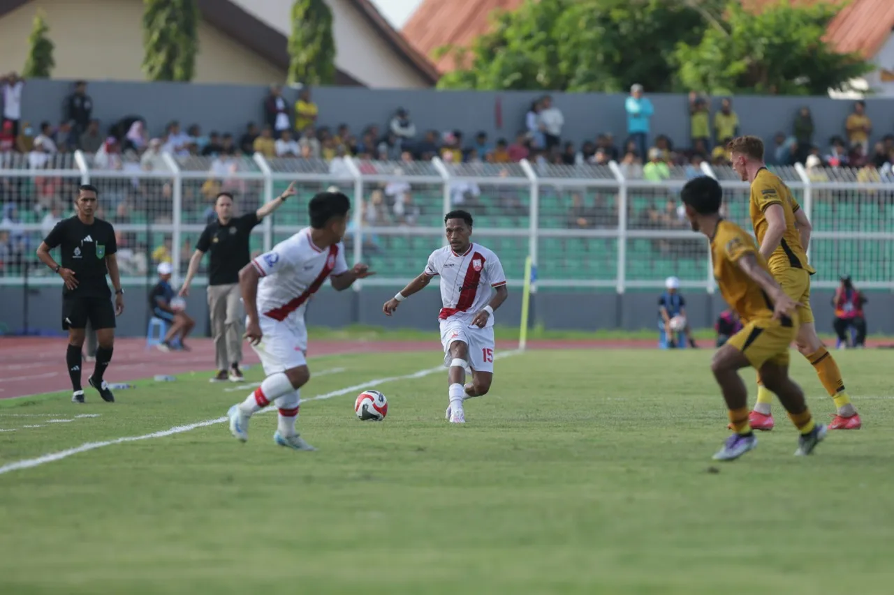 Liputanindo.id – Fullback Persis Solo, Gio Numberi melepaskan umpan kepada Althaf Indie Demi melawan Bhayangkara FC di Stadion Sumpah Pemuda, Bandar Lampung, Jumat (29/8/2025) sore