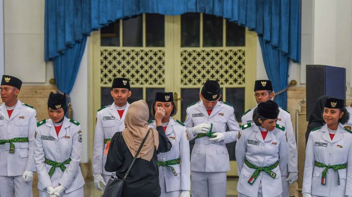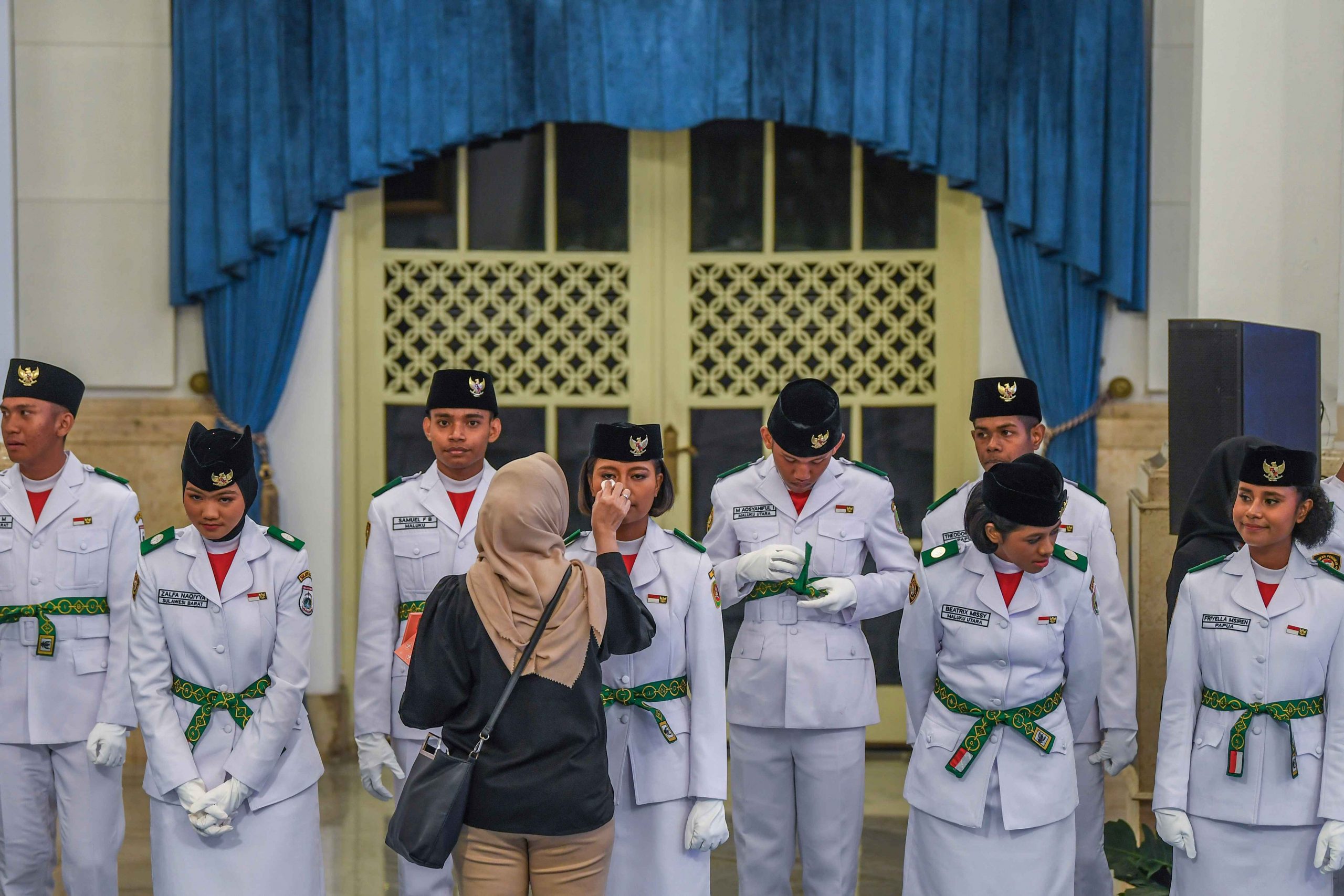 Member Paskibraka 2025 bersiap mengikuti upacara pengukuhan Paskibraka Tingkat Pusat 2025 di Istana Negara, Jakarta, Sabtu (16/8/2025). Menteri Sekretaris Negara Prasetyo Hadi mengukuhkan 76 Member Paskibraka dari 38 provinsi di Indonesia yang akan bertugas dalam Upacara Peringatan HUT Ke-80 RI di Istana Merdeka, Jakarta pada 17 Agustus 2025. ANTARA FOTO/Galih Pradipta/Ppj