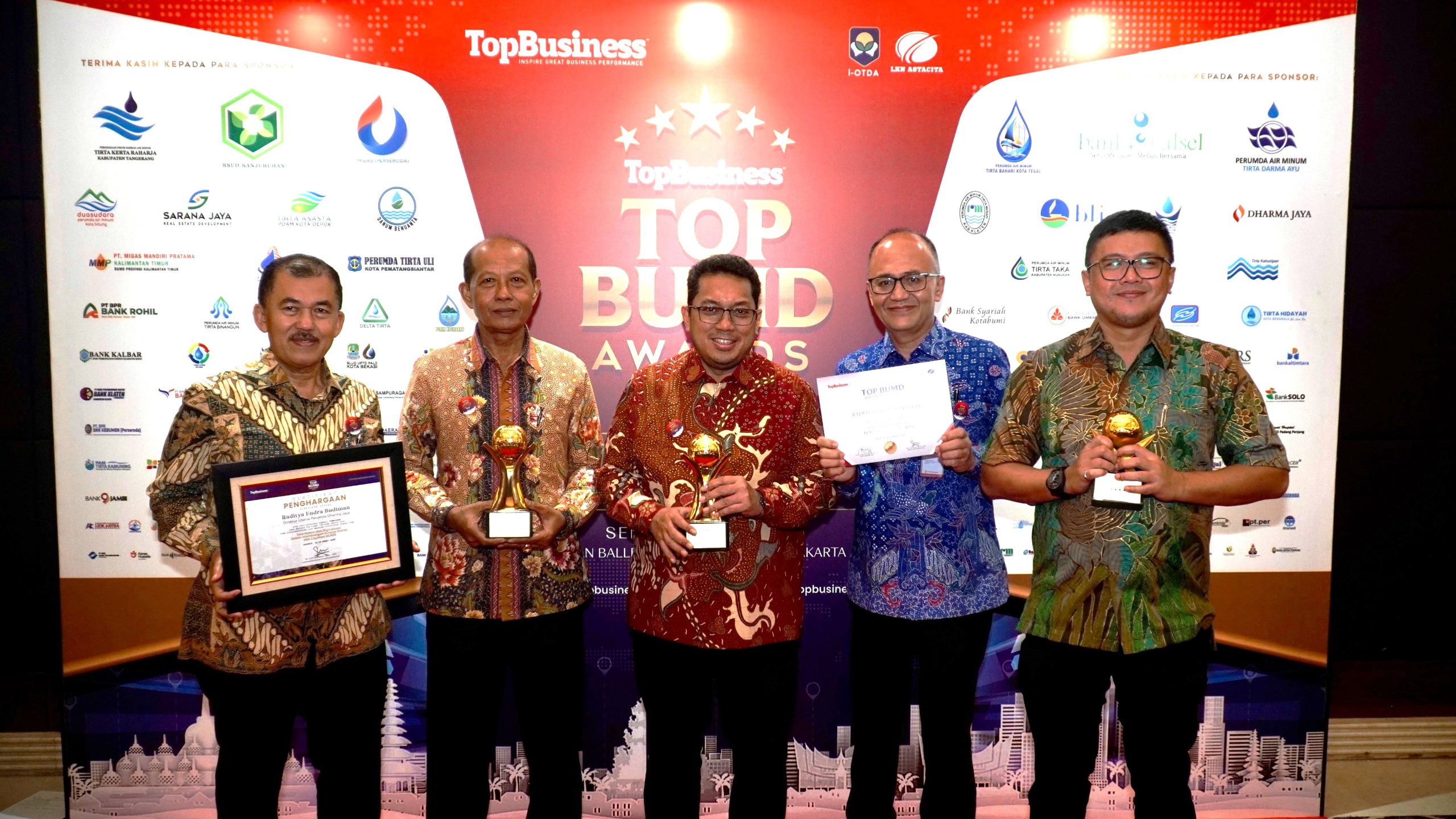 Penghargaan Top BUMD Awards 2025 diberikan di Jakarta kepada sejumlah BUMD dari seluruh Indonesia. Penghargaan tersebut rutin digelar oleh Majalah Top Business berkolaborasi dengan sejumlah lembaga/Ahli, antara lain Institut Otonomi Daerah (I-Otda), dan lain-lain. Berlangsung di Hotel Raffles Jakarta, Senin (28/4), acara puncak Top BUMD Awards 2025 tersebut dihadiri oleh 800-an orang. Mereka berasal dari berbagai kalangan seperti petinggi BUMD, kepala daerah penerima penghargaan, Ahli/konsultan bisnis, media massa, dan lain-lain. Top BUMD Awards 2025 mengangkat topik Tata Kelola dan Digitalisasi dalam Membangun Kinerja Bisnis dan Layanan BUMD. (E-4)