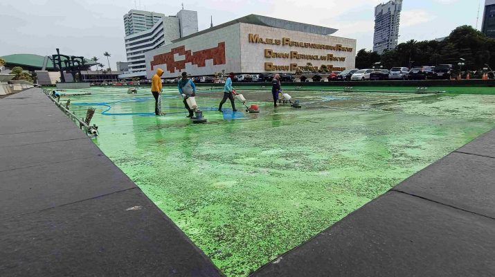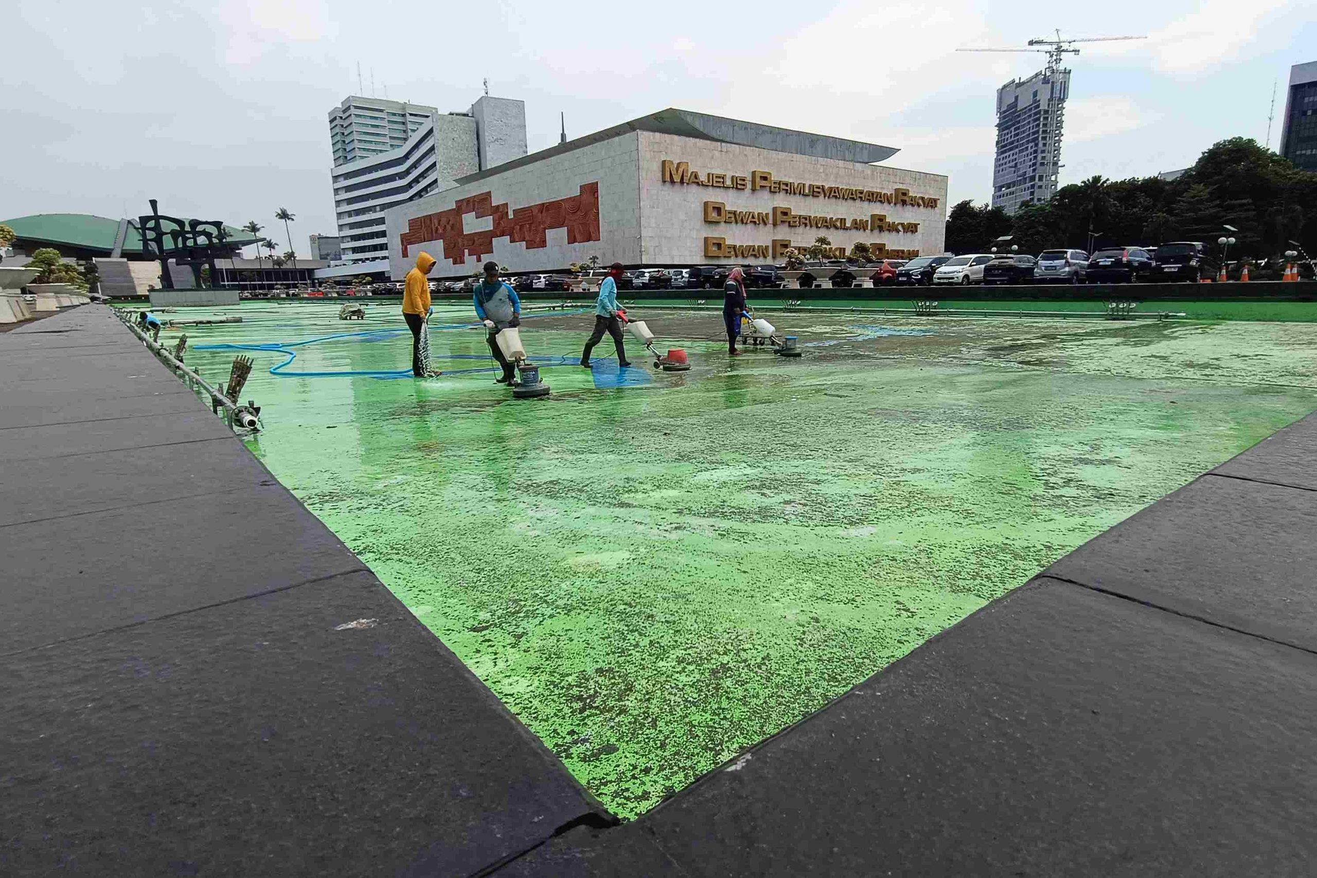 Pekerja membersihkan kolam air mancur di halaman depan gedung, Kompleks Parlemen Senayan, Jakarta, Jumat (20/06/2025). Kegiatan pembersihan kolam tersebut dilakukan sebagai bagian dari perawatan prasarana bangunan kompleks parlemen tersebut. MI/Susanto/Ppj