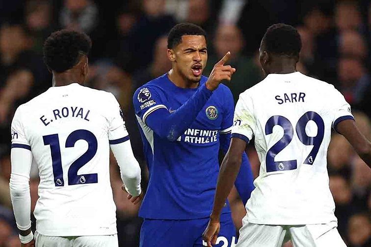 Pemain Chelsea Levi Colwill bentrok dengan pemain Tottenham Hotspur Pape Matar Sarr dalam pertandingan lanjutan Aliansi Inggris di Tottenham Hotspur Stadium, London, Inggris, Senin (6/11/2023). Chelsea menang 4-1 dalam pertandingan yang diwarnai dua kartu merah, tujuh kartu kuning dan 5 gol dianulir tersebut. ANTARA FOTO/Action Images via Reuters/Matthew Childs/rwa.