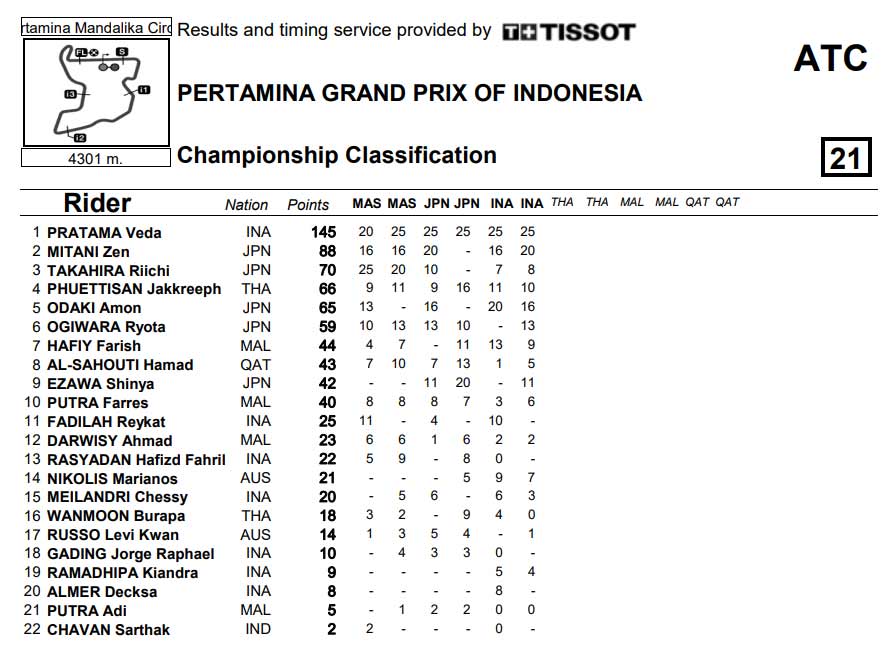 Setelah memenangkan 5 balapan berturut turut, pada persis di pertengahan musim, jelang tiga seri ke depan atau sisa 6 race terakhir, Veda Ega Pratama memimpin klasemen Standar dengan 145 poin dan berjarak sejauh 57 poin dari pengejar terdekatnya Adalah Zen Mitani. Tercatat Veda Tak menang hanya di balapan pertama seri pertama Kepada sementara ini. Pembalap Indonesia terdekat Eksis di posisi 11 yakni Reykat Fadillah. – @liputanindo