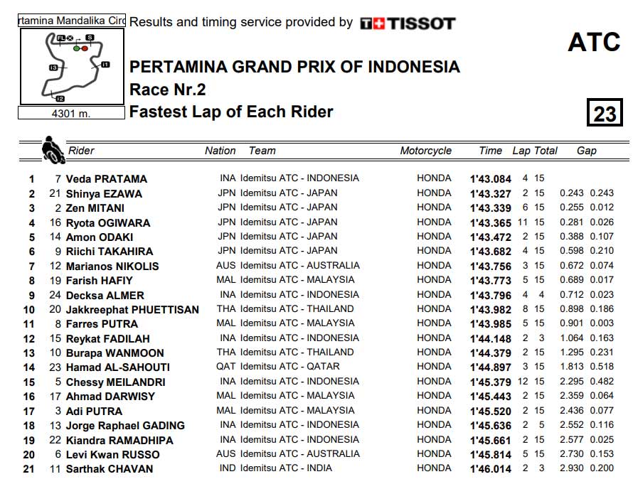 Tetapi Veda termasuk pembalap yang paling efektif memanfaatkan setiap jengkal racing line. Ini dibuktikan dimana Ia menorehkan laptime tercepat sepanjang Race 2 kemarin 1:43,084 detik yang artinya 0,234 detik lebih Segera dari pada Sihinya Ezawa di posisi kedua.