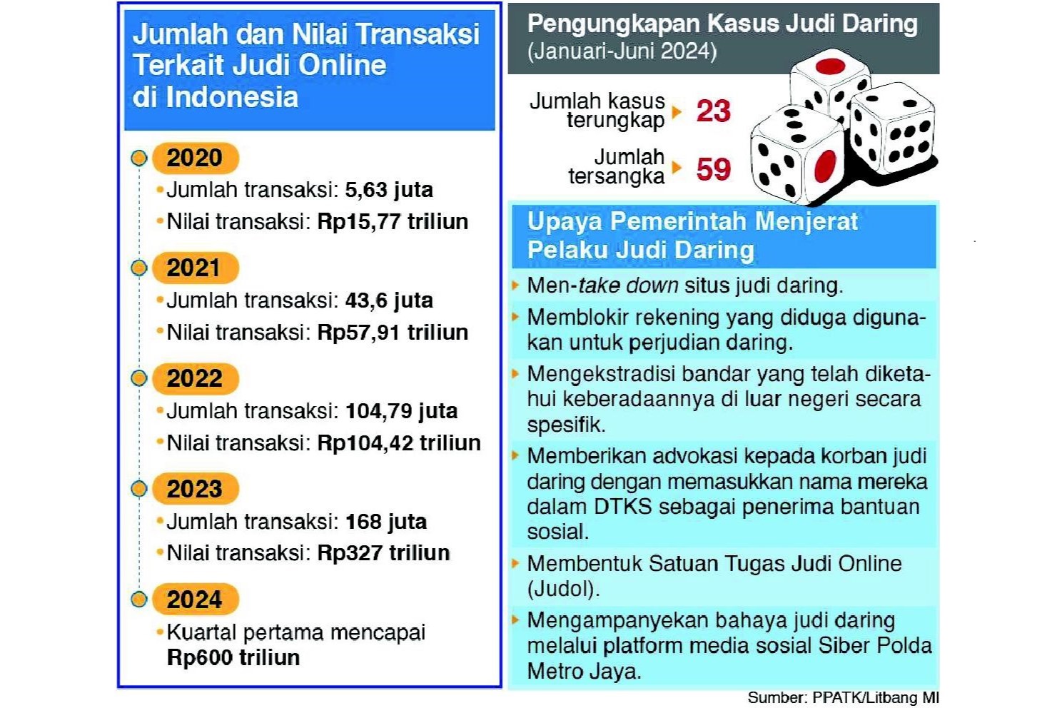 Akibat perbuatannya, para tersangka dijerat Pasal 45 Ayat 3 Jo Pasal 27 Ayat 2 UU Nomor 1 Tahun 2024 tentang ITE dan/atau Pasal 82 dan Pasal 85 UU Nomor 3 Tahun 2011 tentang Transfer Anggaran dan/atau Pasal 303 KUHP dan Pasal 3,4,5 UU Nomor 8 Tahun 2010 tentang TPPU. Dengan ancaman maksimal 20 tahun penjara dan denda maksimal Rp10 miliar. (Yon/P-1)