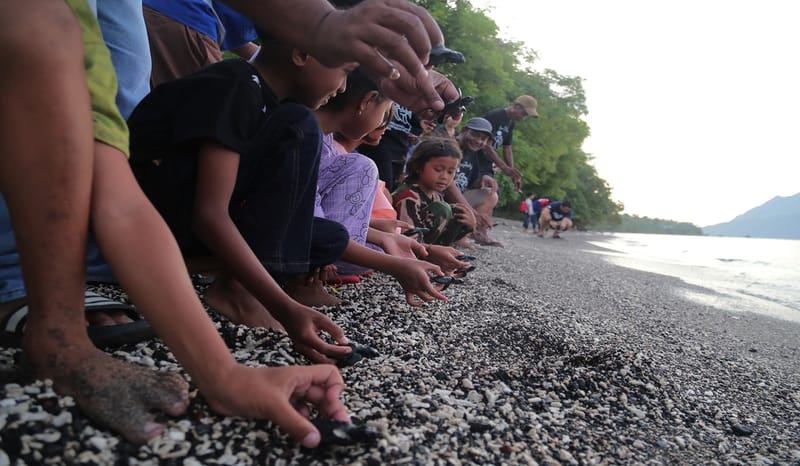 Ilustrasi–Sejumlah anak bersama warga melepaskan tukik atau anak penyu hijau (Chelonia mydas) saat dilepasliarkan di Pantai Tobololo Kota Ternate, Maluku Utara.(ANTARA/Andri Saputra)
