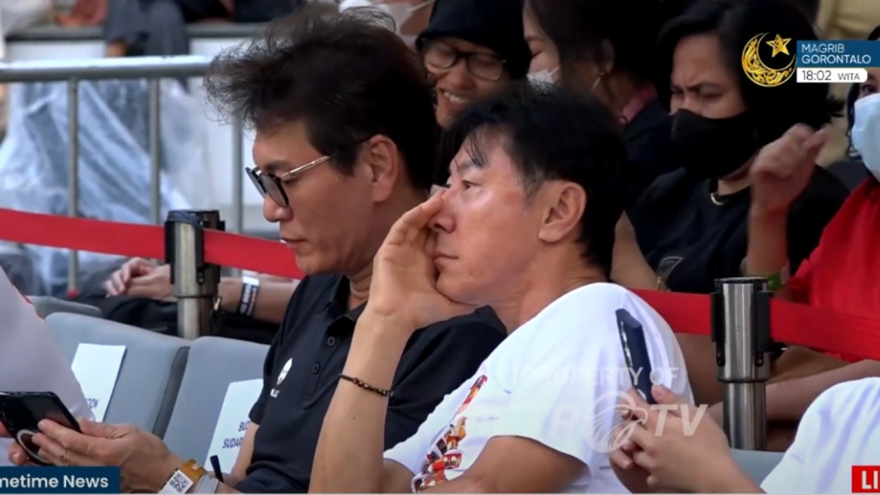 Mantan Instruktur Timnas Indonesia Shin Tae-yong (STY) menonton pertandingan Timnas Indonesia vs Australia di kawasan Atmajaya, Jakarta, Kamis, 20 Maret 2025. STY tampak Bimbang Begitu Menonton Indonesia tertinggal dari Australia.