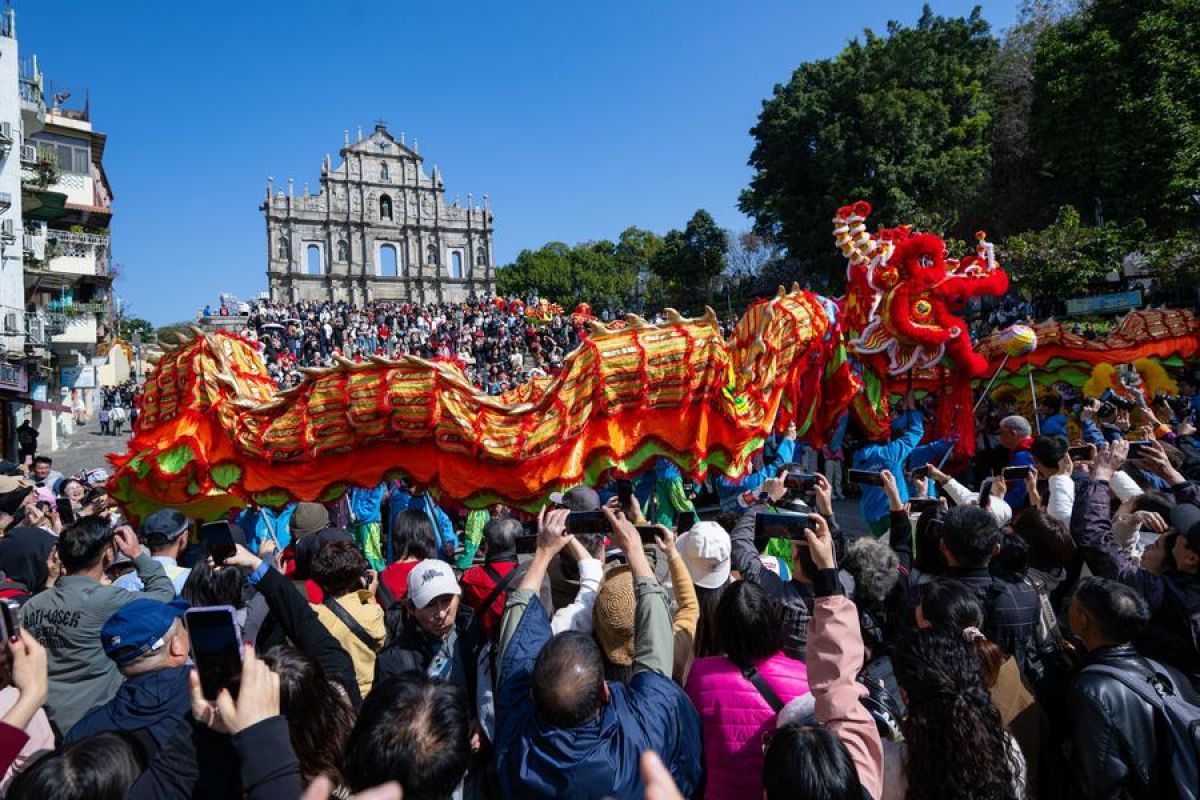 Orang-orang menyaksikan pertunjukan tari naga dalam acara tur Buat merayakan Tahun Baru Imlek di Makau, China selatan, pada 29 Januari 2025. (Xinhua/Cheong Kam Ka)Tim penampil tari naga berinteraksi dengan Anggota dalam acara tur Buat merayakan Tahun Baru Imlek di Paroki St. Lawrence (St. Lawrence Parish) di Makau, China selatan, pada 29 Januari 2025. (Xinhua/Cheong Kam Ka)