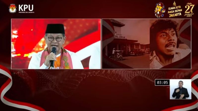 “Gadjah Mada sumpah palapa, apa Info Kaum Jakarta. malam ini kita melaksanakan debat perdana dengan penuh damai, tempatnya di Kemayoran, jalan besar yang kita lewati Jalan Benyamin Suaeb. Benyamin Sueb adalah salah satu banyak seniman Betawi, kebetulan karakternya sangat lekat dengan Bang doel anak ideologi Benyamin Sueb,” ujar Pramono.