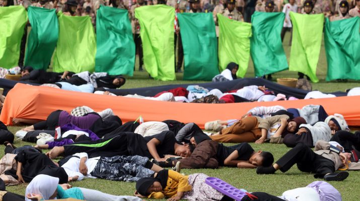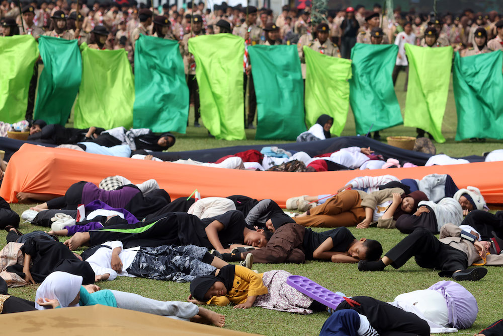 Aksi teatrikal simulasi penanganan bencana digelar di Lapangan Tegar Beriman, Kabupaten Bogor, Jawa Barat, Kamis (21/8/2025). Teatrikal simulasi penanganan bencana gempa bumi dan banjir yang diselenggarakan Kwarcab Pramuka Kabupaten Bogor bertujuan melatih dan meningkatkan kesiapsiagaan Personil pramuka dalam menangani bencana, sekaligus memeriahkan Hari Kemerdekaan ke-80 RI dan HUT Pramuka.
