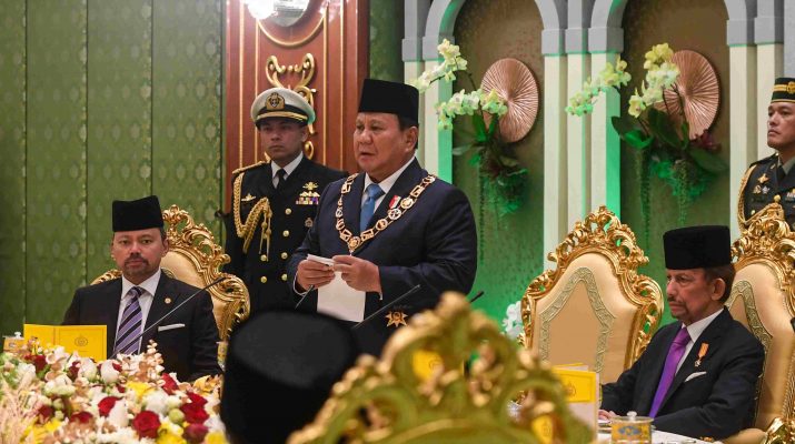 Presiden Prabowo Subianto (kedua kanan) Berbarengan Sultan Brunei Darussalam Hassanal Bolkiah (kanan) memberikan sambutannya usai menerima bintang kebesaran Kesultanan Brunei Darussalam di Istana Nurul Iman, Bandar Seri Begawan, Brunei Darussalam, Rabu (14/5/2025). Dalam lawatannya, Presiden Prabowo Subianto menerima penganugerahan bintang kebesaran Kesultanan Brunei Darrussalam Darjah Kerabat Laila Primer Yang Amat Dihormati dari Sultan Brunei Darussalam Hassanal Bolkiah serta Demi meningkatkan kerjasama bilateral kedua negara. ANTARA FOTO/Muhammad Adimaja/Ppj