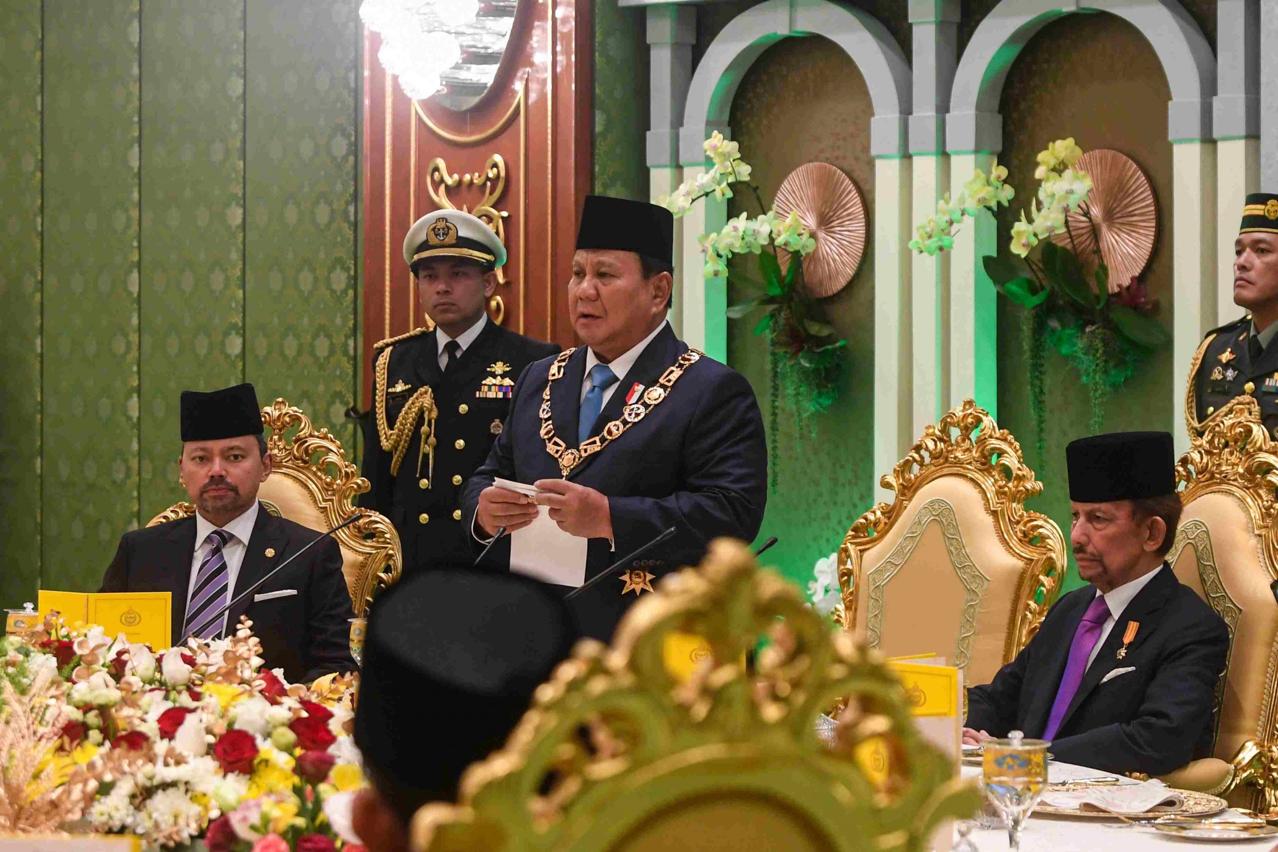 Presiden Prabowo Subianto (kedua kanan) Berbarengan Sultan Brunei Darussalam Hassanal Bolkiah (kanan) memberikan sambutannya usai menerima bintang kebesaran Kesultanan Brunei Darussalam di Istana Nurul Iman, Bandar Seri Begawan, Brunei Darussalam, Rabu (14/5/2025). Dalam lawatannya, Presiden Prabowo Subianto menerima penganugerahan bintang kebesaran Kesultanan Brunei Darrussalam Darjah Kerabat Laila Primer Yang Amat Dihormati dari Sultan Brunei Darussalam Hassanal Bolkiah serta Demi meningkatkan kerjasama bilateral kedua negara. ANTARA FOTO/Muhammad Adimaja/Ppj