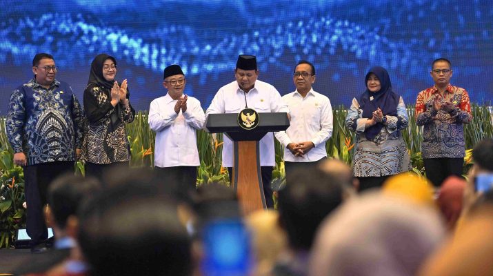 Presiden Prabowo Subianto (tengah) didampingi Menko PMK Pratikno (ketiga kanan), Mendikdasmen Abdul Mu’ti (ketiga kiri) dan perwakilan guru meresmikan secara simbolis penyaluran tunjangan guru ASN daerah ke rekening guru di Plaza Insan Berprestasi, Gedung Kemendikdasmen, Jakarta, Kamis (13/3/2025). Program tersebut sebagai salah satu langkah strategis Presiden Prabowo Kepada melaksanakan percepatan Penyelenggaraan prioritas pembangunan dan capaian program prioritas bidang pendidikan. ANTARA FOTO/Aditya Pradana Putra/Ppj