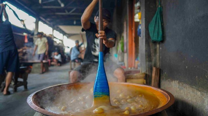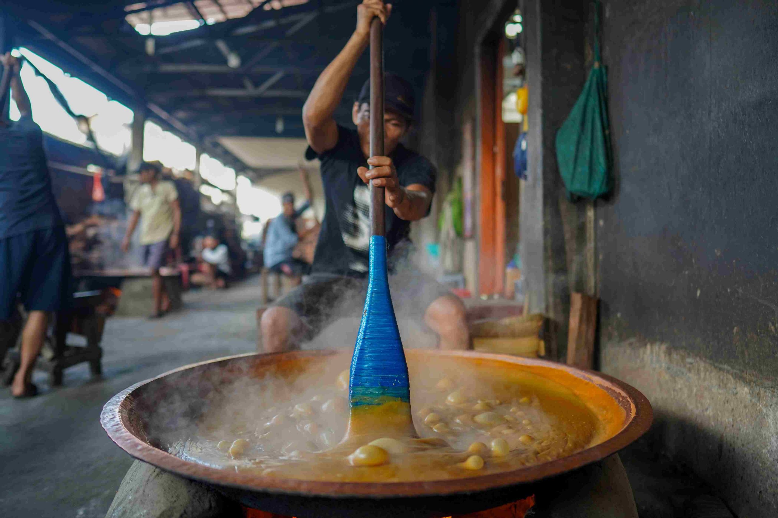 Sejumlah pekerja memproduksi dodol betawi di Sari Rasa Bu Yuyun, Jakarta, Rabu (12/3/2025). Produksi dodol di tempat tersebut mengalami peningkatan hingga enam kali lipat menjelang Idul Fitri karena banyaknya permintaan konsumen, dodol itu dijual seharga Rp25 ribu hingga Rp130 ribu. ANTARA FOTO/Ferlian Septa Wahyusa/Ppj