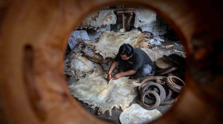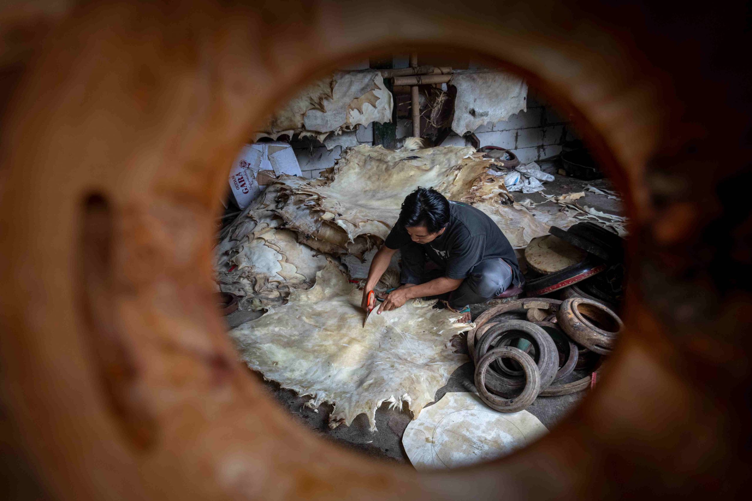 Pekerja menyelesaikan pembuatan kerajinan rebana di rumah produksi rebana dan bedug generasi ketiga H Zaini, Desa Krangmlati, Kabupaten Demak, Jawa Tengah, Rabu (18/6/2025). Hasil produksi bedug dan rebana berbahan baku kayu mahoni, trembesi, dan jati dengan kulit kerbau atau sapi tersebut selain dipasarkan ke berbagai Kawasan di Indonesia Rp3 juta-Rp12 juta per set Buat rebana dan Rp15 juta-Rp150 juta per unit Buat bedug juga telah menembus pasar Brunei Darussalam, Malaysia, Singapura dan Inggris melalui pemasaran media digital maupun ajang promosi pertukaran budaya antarnegara. ANTARA FOTO/Aji Styawan/Ppj