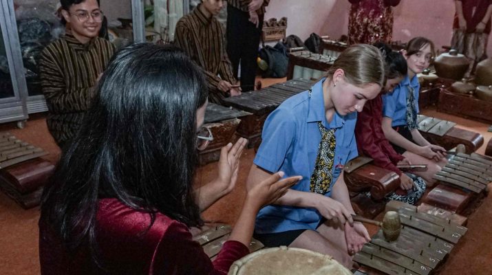 Dua pelajar luar negeri dari MacKillop Catholic College Australia Serempak pelajar SMA N 2 Batang memainkan alat musik tradisional Jawa Ketika pertukaran pelajar di SMA N 2 Batang, Kabupaten Batang, Jawa Tengah, Senin (8/9/2025). Pertukaran pelajar dalam Bridge School Partnerships Program itu menghadirkan enam pelajar dari MacKillop Catholic College Australia di SMA N 2 Batang yang bertujuan Kepada memperkaya wawasan dan pemahaman lintas budaya, meningkatkan kemampuan berbahasa asing, dan menambah pengetahuan akademik antarpelajar. ANTARA FOTO/Harviyan Perdana Putra/Ppj