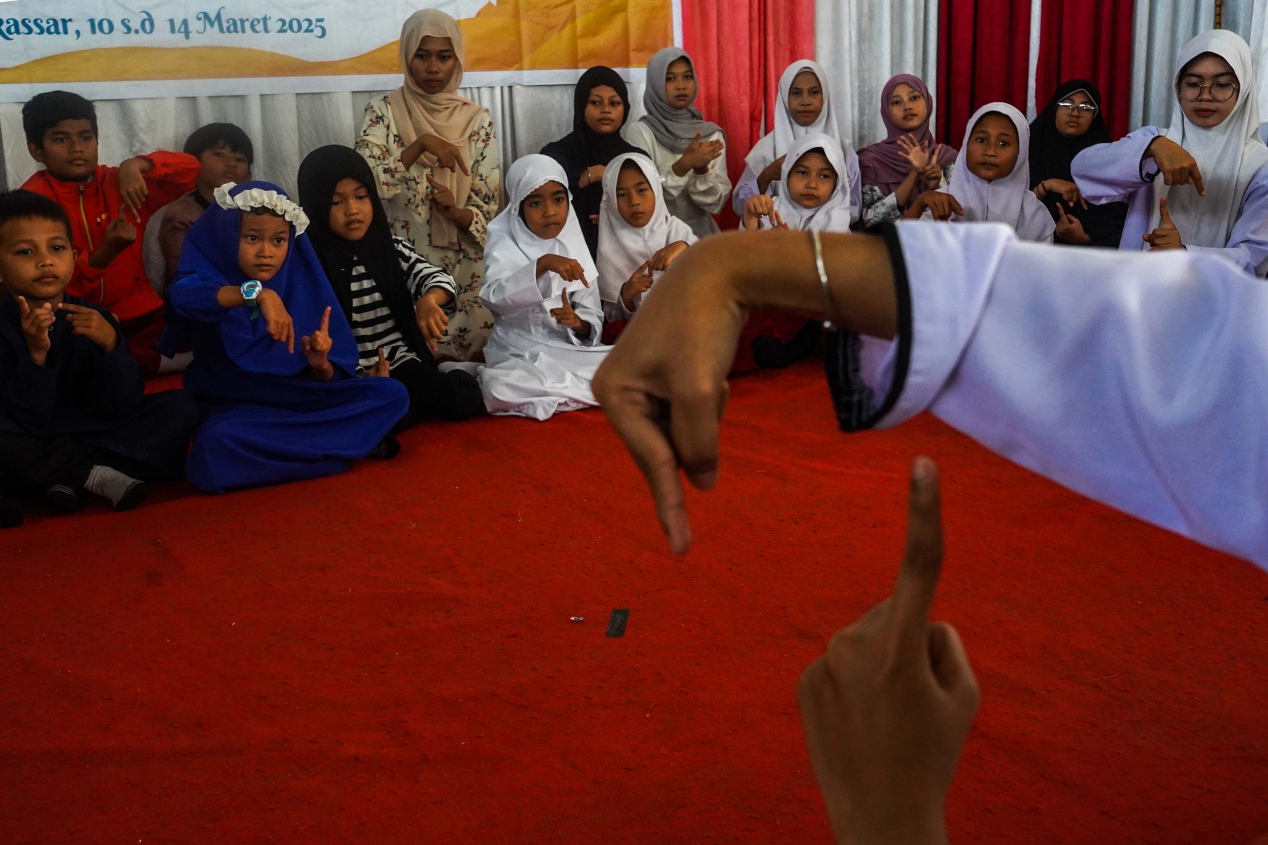 Siswa tunarungu membacakan surat Al Fatihah menggunakan bahasa isyarat Begitu mengikuti program Ramadan Mengaji Andalan Hati di SLB Negeri 1 Makassar, Sulawesi Selatan, Senin (10/3/2025). Melalui program ini diharapkan menjadi tradisi tahunan di sekolah-sekolah sebagai bagian dari pembentukan Watak siswa yang Bukan hanya unggul dalam ilmu pengetahuan, tetapi juga Mempunyai nilai-nilai keislaman dan kebersamaan. ANTARA/Hasrul Said/rwa/rdi
