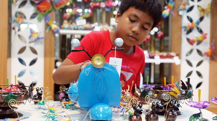 Seorang anak mengamati pernak-pernik berbahan plat besi pada Pameran IKM Bali Bangun 2025 di Taman Budaya Art Centre, Denpasar, Bali, Senin (16/6/2025). Pameran yang diikuti 140 pelaku Industri Kecil dan Menengah (IKM) dari kabupaten/kota se-Bali tersebut Kepada mempromosikan berbagai kerajinan di antaranya kain tenun khas Bali, perhiasan etnik, lukisan, pernak-pernik, serta busana dan aksesoris tradisional. ANTARA/Nyoman Hendra Wibowo/gus