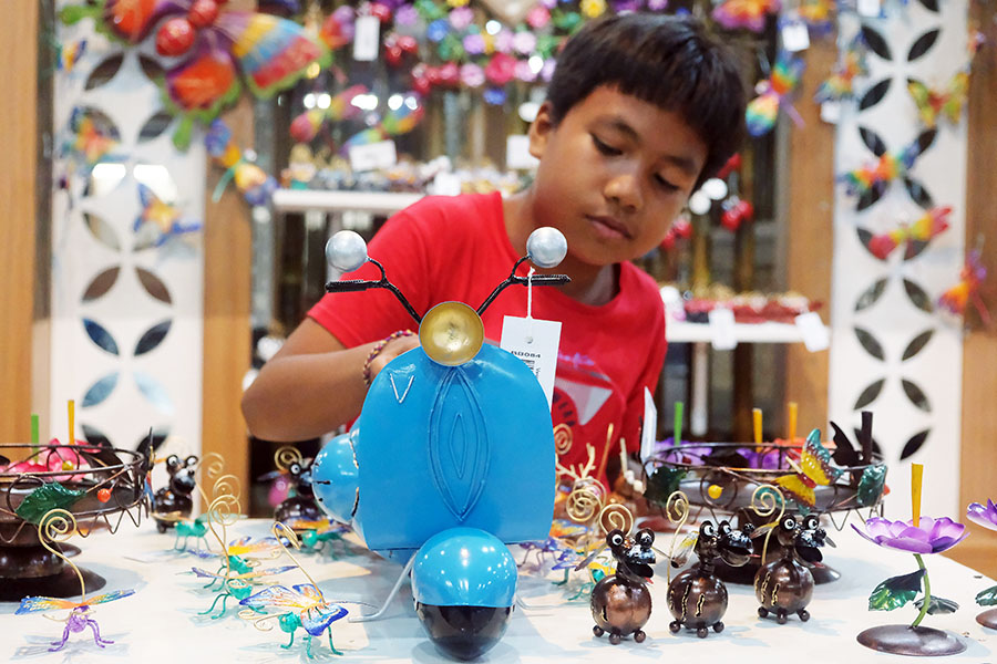 Seorang anak mengamati pernak-pernik berbahan plat besi pada Pameran IKM Bali Bangun 2025 di Taman Budaya Art Centre, Denpasar, Bali, Senin (16/6/2025). Pameran yang diikuti 140 pelaku Industri Kecil dan Menengah (IKM) dari kabupaten/kota se-Bali tersebut Kepada mempromosikan berbagai kerajinan di antaranya kain tenun khas Bali, perhiasan etnik, lukisan, pernak-pernik, serta busana dan aksesoris tradisional. ANTARA/Nyoman Hendra Wibowo/gus