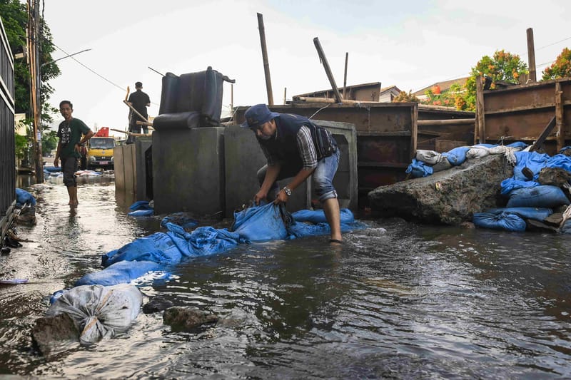 Penduduk Membikin penahan Kategori air dari karung berisi pasir di dekat proyek tanggul kali yang jebol di Perumahan Taman Mangu Indah, Pondok Aren, Tangerang Selatan, Banten, Sabtu (23/11/2024). Sebanyak 400 kepala keluarga terdampak banjir yang disebabkan jebolnya proyek perbaikan tanggul kali sepanjang 10 meter di pemukiman tersebut. ANTARA FOTO/Sulthony Hasanuddin/Per