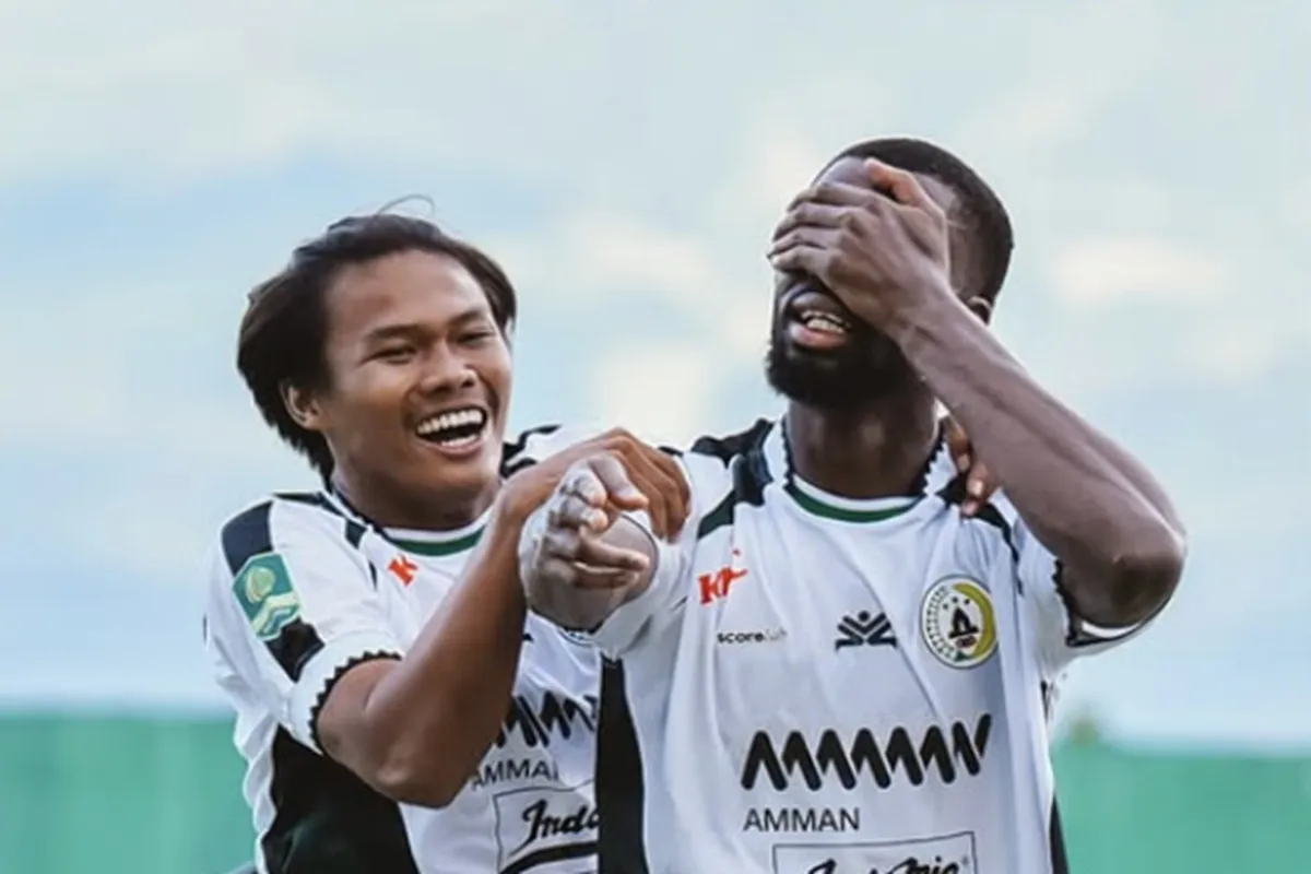 Liputanindo.id – Penyerang PSS Sleman, Frederic Injai (kanan), melakukan selebrasi seusai menjebol gawang Persipa Palu dalam laga Aliansi 2 2025/2026 atau Pengadaian Championships, Minggu (5/10/2025). PSS menang dengan skor telak 3-0. (Instagram/pssleman)