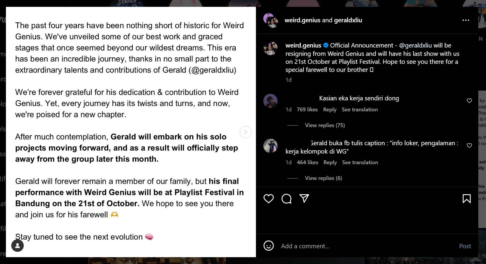 Dalam unggahan tersebut, Weird Genius juga mengumumkan alasan Gerald Liu memutuskan hengkang.