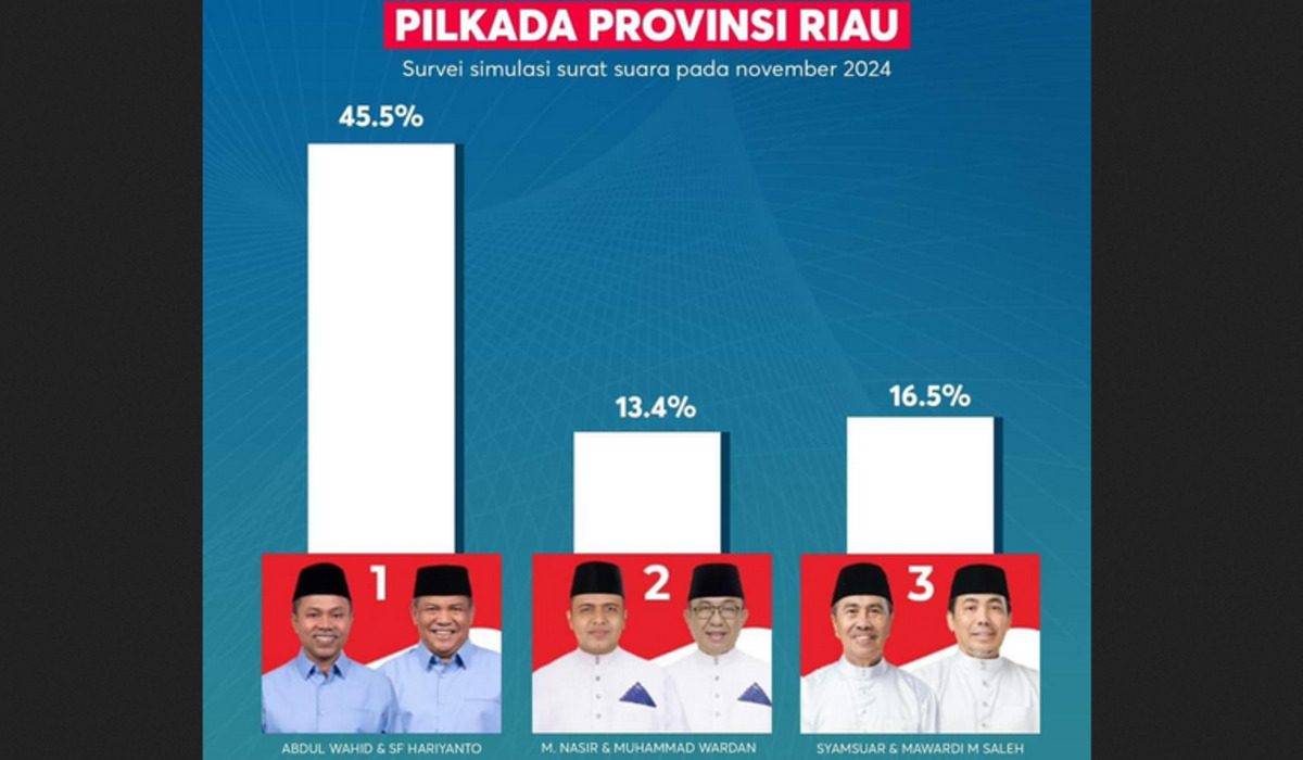 “Tingkat elektabilitas 45,5% paslon Abdul Wahid-SF Hariyanto yang diusung PKB, NasDem, PDIP telah jauh meninggalkan elektabilitas paslon incumbent nomor urut 3 yang diusung koalisi Partai Golkar, PKS Syamsuar-Mawardi Muhammad Saleh yang hanya sebesar 16,5%. Kemudian paslon nomor urut 2 M Nasir-M Wardan yang diusung Gerindra, Demokrat, PAN, PPP dengan elektabilitas sebesar 13,4%,” jelasnya.