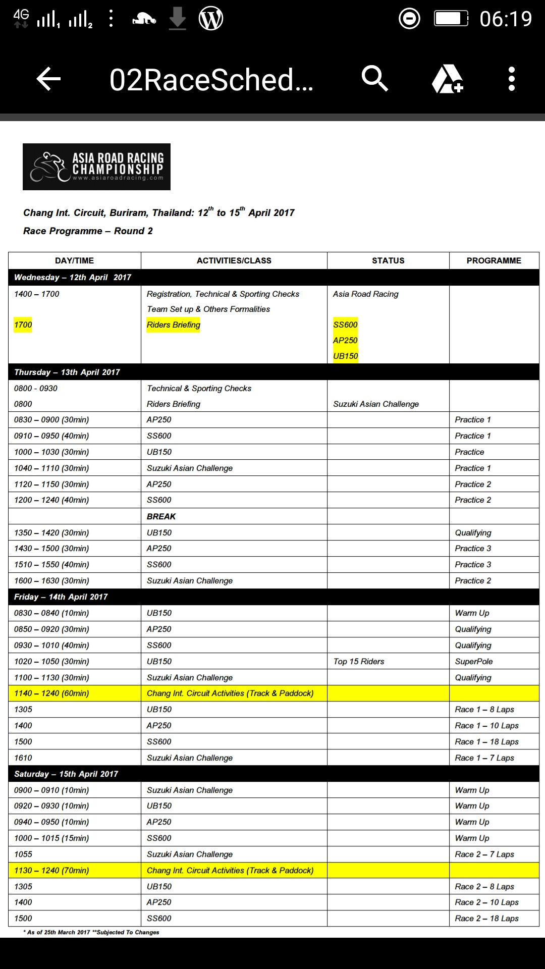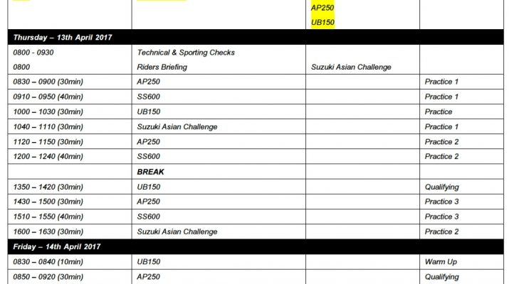 Di jadwal atas sobat Bisa lihat bahwa sebelum Kualifikasi kelas UB150 hanya menghadirkan Satu Kali sesi latihan bebas, Lampau kelas SAC Dua Kali sesi FP, Sedangkan Kelas AP250 Dan SS600 melakukan tiga Kali latihan bebas. Race 1 Demi Seluruh kelas diadakan pada hari jumat setelah tengah hari, Sedangkan Race 2 Demi Seluruh kelas dilakukan pada hari Sabtu mulai jam 10 an pagi.