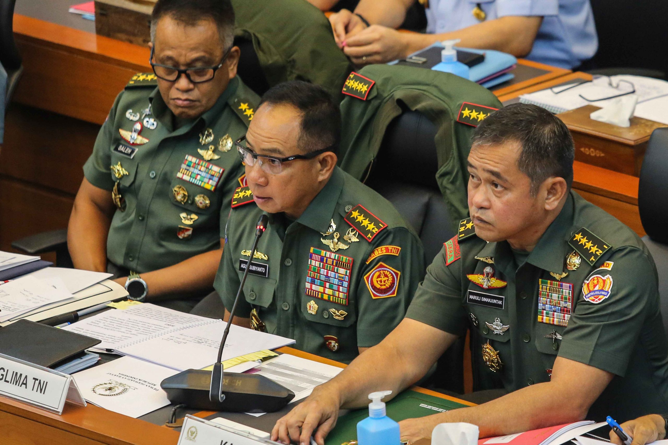 Panglima TNI Jenderal TNI Agus Subiyanto (tengah) didampingi KSAD Jenderal TNI Maruli Simanjuntak (kanan), dan Irjen TNI Letjen TNI Muhammad Saleh Mustafa (kiri) menyampaikan paparan Ketika rapat kerja dengan Komisi I DPR di Kompleks Parlemen, Senayan, Jakarta, Kamis (13/3/2025). Rapat tersebut Buat mendapatkan masukan terkait perubahan UU No 34 Tahun 2004 tentang TNI khususnya berkenaan dengan prinsip supremasi sipil yang menjadi landasan Penting negara demokrasi. ANTARA FOTO/Asprilla Dwi Adha/Ppj
