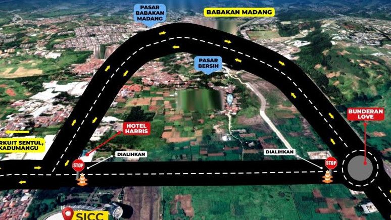 Kemudian, kendaraan dari arah Sentul City yang hendak ke Kadumangu atau Sirkuit Sentul melalui SICC dialihkan melewati jalur Pasar Bersih Sentul City.