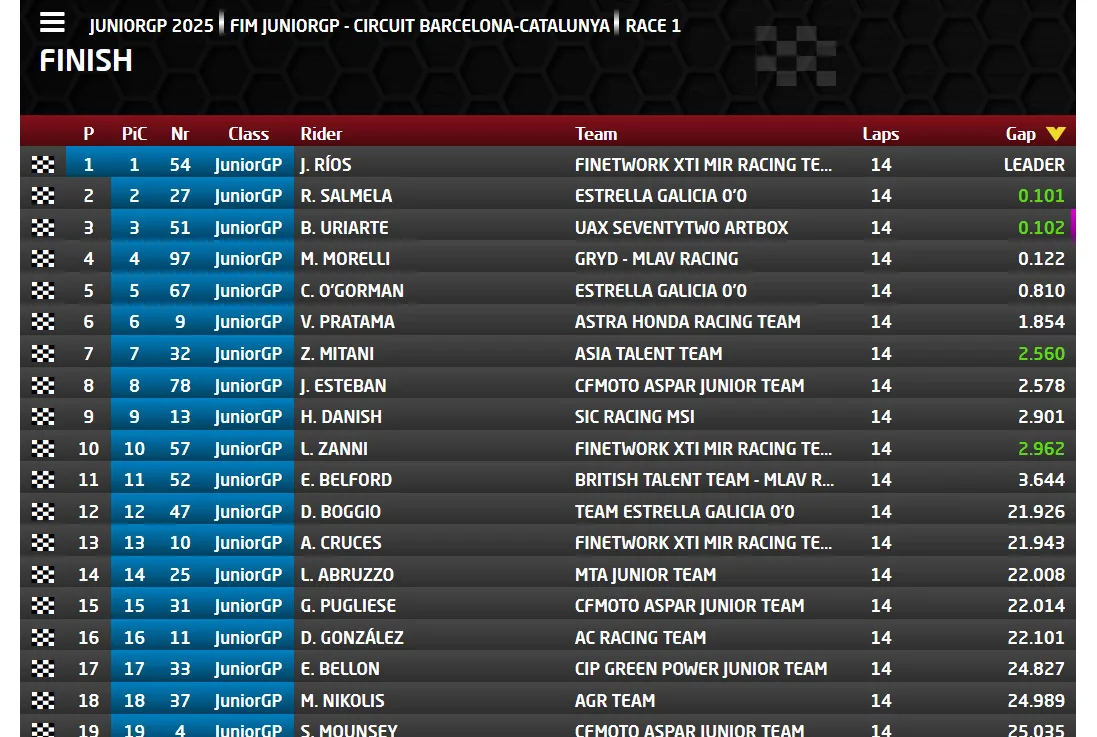 liputanindo.com – Karena kesalahan, Ramadhipa dan beberapa Pebalap Di grupnya harus mendapatkan Penalti sehingga Pebalap Indonesia ini harus start dari Posisi grid 24 pada Race ETC Catalunya 2025 . . Tetapi hal ini Enggak Membangun Rama Patah Semangat, Ia merangsek satu persatu posisi Tamat akhirnnya memenangkan race sensasional ini