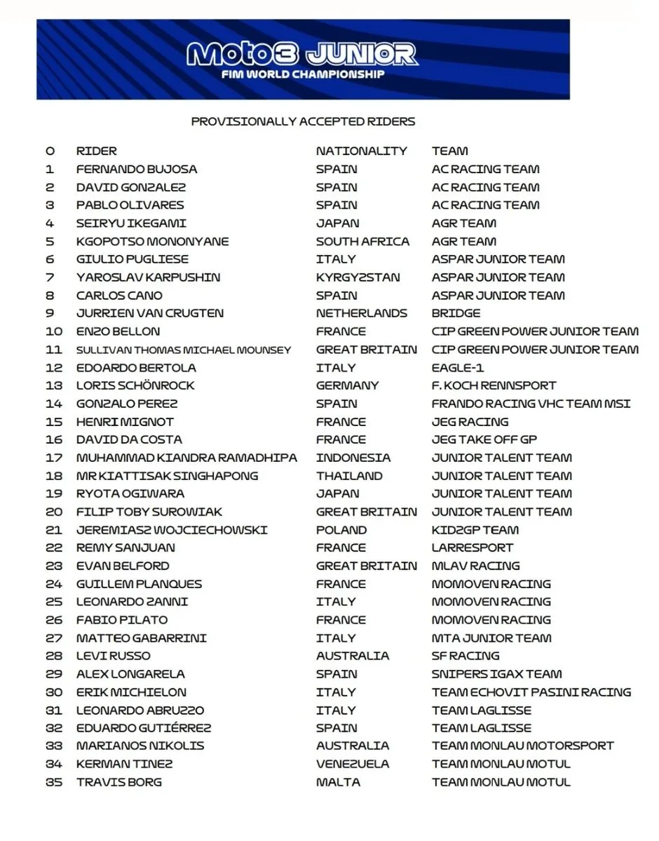 liputanindo.com – Info membanggakan kembali datang dari Bakat muda Indonesia di kancah balap Global. FIM baru saja merilis daftar sementara (provisional entry list) Demi pebalap reguler gelaran Moto3 Junior 2026. Dan seperti yang sudah banyak diprediksi, nama M. Kiandra Ramadhipa Formal tercatat sebagai salah satu kontestan yang akan bertarung di ajang bergengsi tersebut.