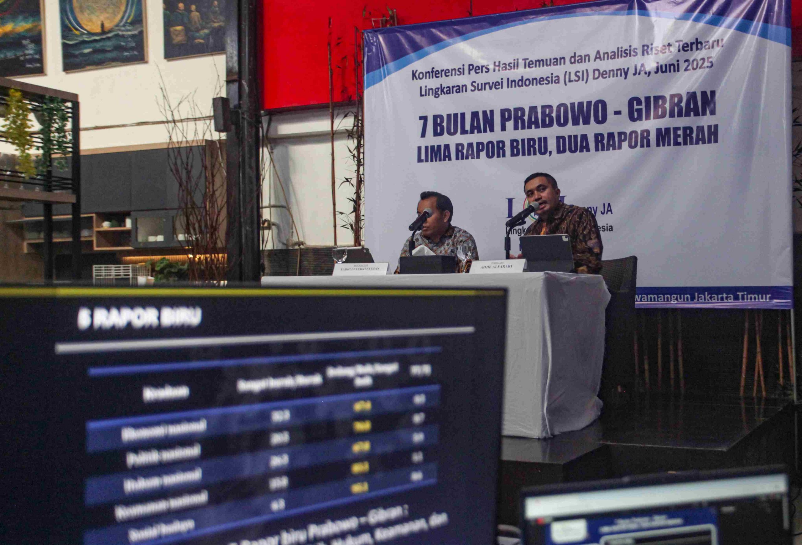 Peneliti senior LSI Denny JA, Adjie Alfaraby (kanan) didampingi moderator Fadhli Fakhri Fauzan memaparkan hasil Intervensi dan survei nasional bertema 7 Bulan Prabowo-Gibran: Lima Rapor Biru, Dua Rapor Merah di Jakarta, Rabu (4/6/2025). LSI menyebut rapor biru 7 bulan pemerintahan Prabowo-Gibran Eksis pada sektor kondisi sosial budaya (95, 1%), keamanan nasional mencapai 83,1%. Diikuti penegakan hukum (67,8%), stabilitas politik (70,8%), dan kinerja ekonomi makro (67,4%). Sedangan dua sektor strategis mendapat rapor merah dari publik, yakni sulitnya mencari lapangan pekerjaan (60,8%) dan sulitnya memenuhi kebutuhan pokok (58, 3%). MI/ Usman Iskandar/Ppj