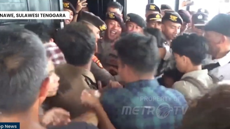 Aksi saling dorong antara ratusan petani dan mahasiswa dengan aparat kepolisian terjadi di Gedung DPRD Konawe, Sulawesi Tenggara. Aksi ini berujung ricuh.