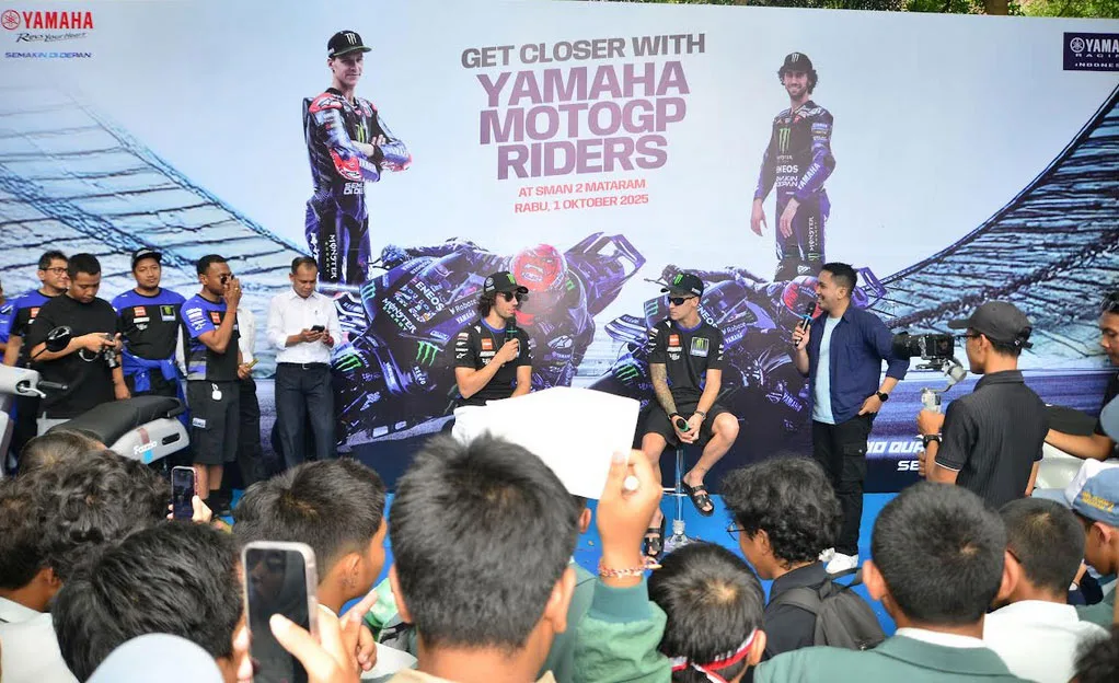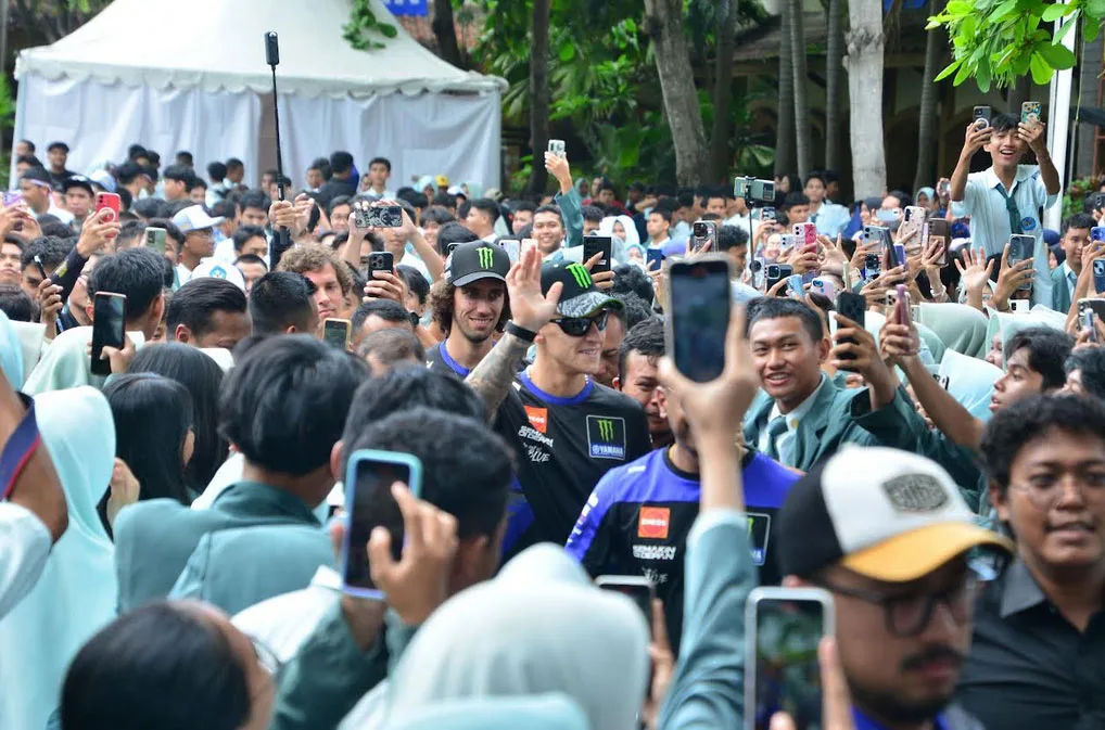 Berkumpul di SMA Negeri 2 Mataram Nusa Tenggara Barat salah satu sekolah favorit di Daerah itu dan kerap berkolaborasi dalam berbagai event Yamaha, seketika suasana sekolah penuh keriuhan. Euforia tak tertahankan menyambut kedatangan pembalap kelas dunia yang jadi pujaan banyak orang. Ratusan siswa-siswi SMA Negeri 2 Mataram antusias menerima kunjungan tamu spesial Fabio Quartararo dan Alex Rins. Selain itu, rider binaan Yamaha Racing Indonesia, Wahyu Nugroho dan M Faerozi juga ikut hadir kian memeriahkan acara.