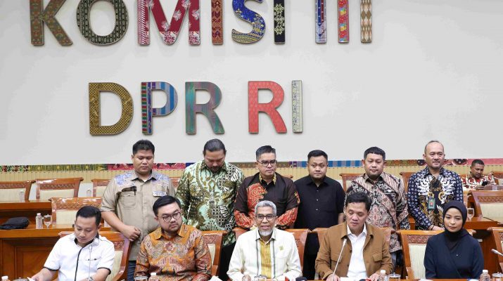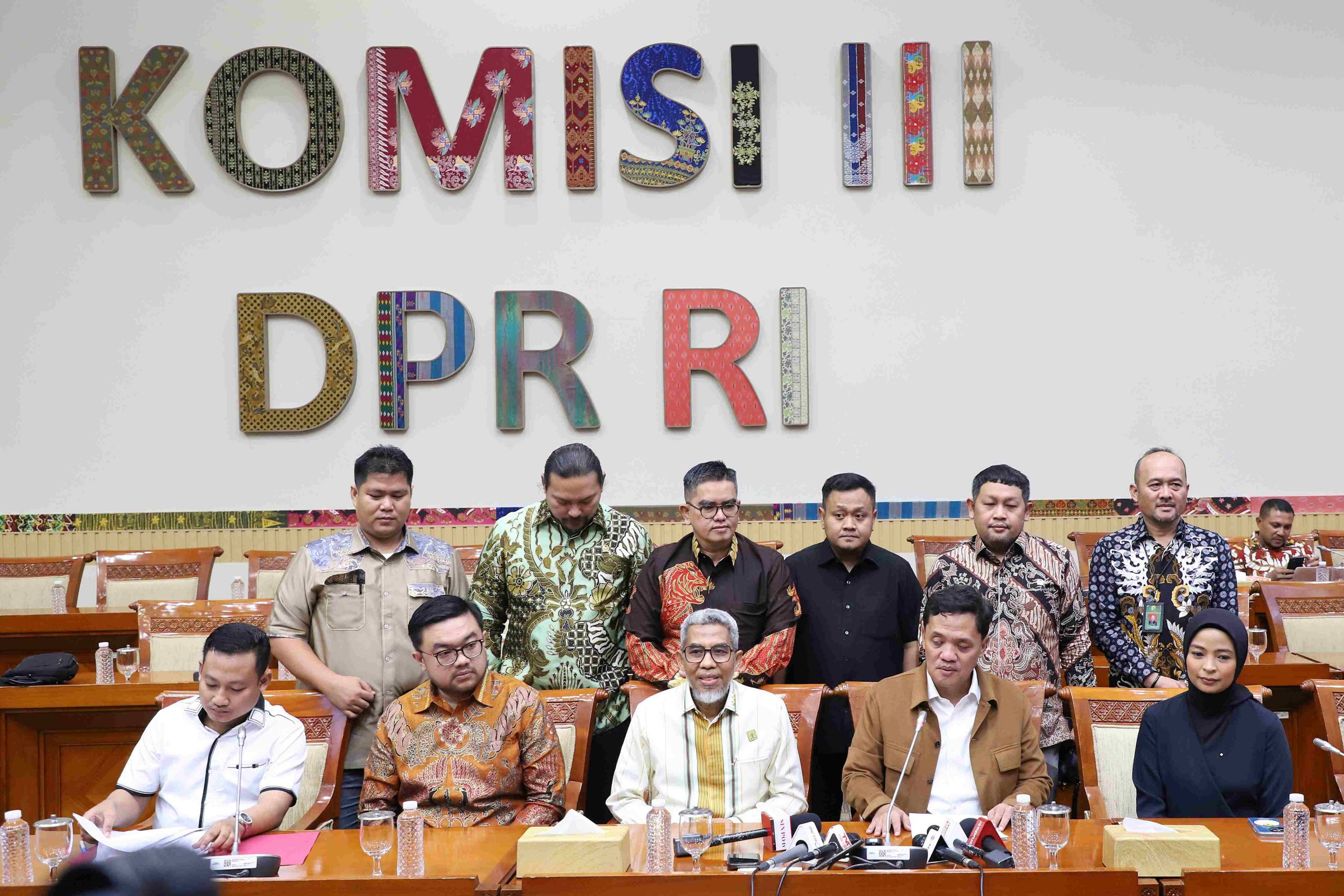 Ketua Komisi III DPR RI Habiburokhman (tengah) Berbarengan Dirjen Kekayaan Intelektual Kementerian Hukum Razilu (kiri), dan Vokalis Kotak Tantri Syalindri (kanan) menyampaikan keterangan pers usai melakukan pertemuan tertutup di Ruang Komisi III DPR, Kompleks Parlemen Senayan, Jakarta, Jumat (20/06/2025). RDP dan RDPU tersebut mendengarkan keterangan terkait Kasus tergugat Ialah Penyanyi dan Pelaku Pertunjukan telah menggunakan Tembang “Bilang Saja” secara komersil tanpa izin pencipta Tembang. MI/SUSANTO
