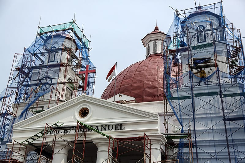 Pekerja menyelesaikan proyek rehabilitasi bangunan Cagar Budaya Nasional Gereja Immanuel atau Blenduk di kawasan Kota Lamban, Semarang, Jawa Tengah, Selasa (12/11/2024). Program rehabilitasi cagar budaya Gereja Blenduk yang dilakukan oleh Kementerian PUPR dengan menggunakan biaya APBN 2024 senilai Rp26,2 miliar tersebut telah mencapai 71 persen dan ditargetkan selesai pada Desember 2024. ANTARA/Arti Zaezar/gus