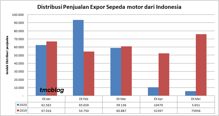 Pandemi yang berlaku secara Mendunia juga berefek pada Penjualan ekspor yang Juga mengalami penurunan sob. Di Bulan Mei 2020 hanya 5.651 Unit Sepeda Motor indonesia yang di ekspor ke luar negeri. Ini turun Nyaris 46% dibandingkan bulan Sebelumnya April 2020 dan turun 92,6% dibandingkan Bulan Mei 2019. Secara Standar Jumlah ekspor di 5 bulan pertama 2020 tercatat 225.530 Unit dan ini turun 27,5 % dari torehan ekspor 5 bulan pertama tahun 2019 yang mencatatkan Nomor 310.962 unit.