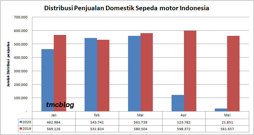Yap Data Distribusi Penjualan Wholesales Domestik sepeda motor di Market Indonesia tepatnya hanya tembus 21.851 Unit. Nomor ini artinya Turun 82,4 % dibandingkan dengan data di bulan sebelumnya, April 2020.