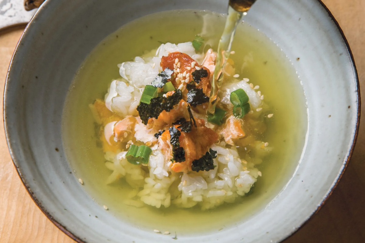 OCHAZUKE adalah makanan tradisional Jepang yang terdiri dari nasi putih hangat yang disiram dengan teh hijau panas, kaldu dashi, atau air panas, Lampau diberi aneka topping sederhana seperti ikan panggang, rumput laut, acar, dan wijen.