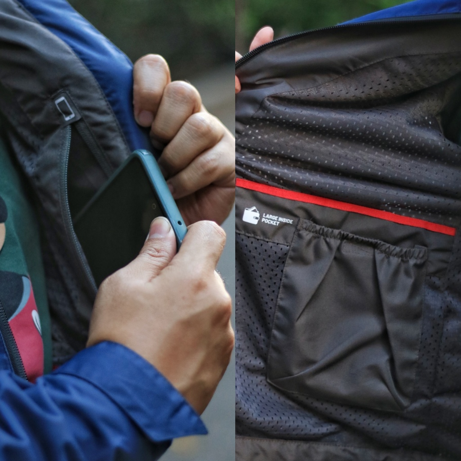 Inner pocket saku bagian dalam jaket yang terdapat satu buah pada bagian dada dengan penutup ritsleting, dan satu saku di samping kanan dalam dengan penutup velcro yang Pandai memuat satu dompet yang sakunya dilengkapi lapisan anti basah.
